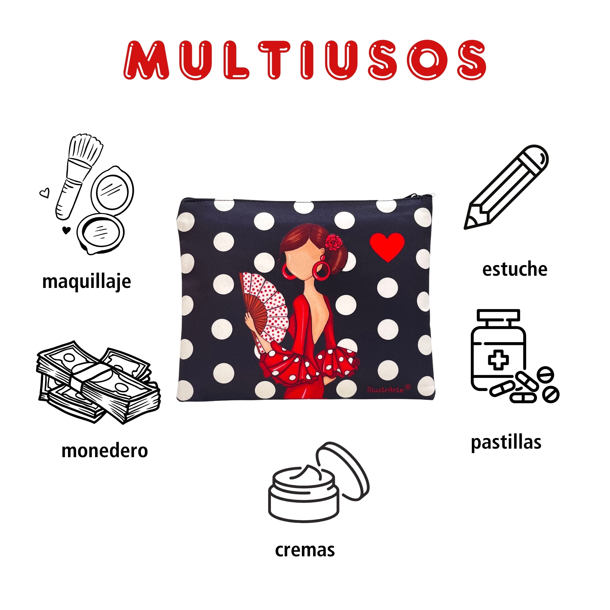 Neceser o Estuche Granada “Flamenca Pepa” – Diseño Doble Cara – Fondo Negro con Lunares Blancos – 22x17 cm – Impermeable – Bolsa de Aseo, Maquillaje o Material Escolar