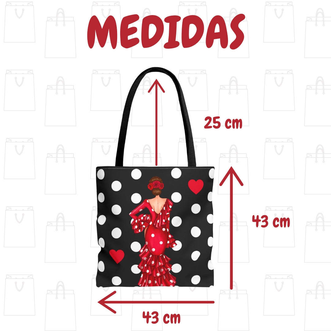 👜 illustrArte Bolsa Tote Málaga Diseño Flamenca “Macarena” Negro con Lunares | Poliéster 400 g/m² (43 x 43 cm) | Impresión a Doble Cara | Asas de 60 cm | Bolso Shopper Resistente