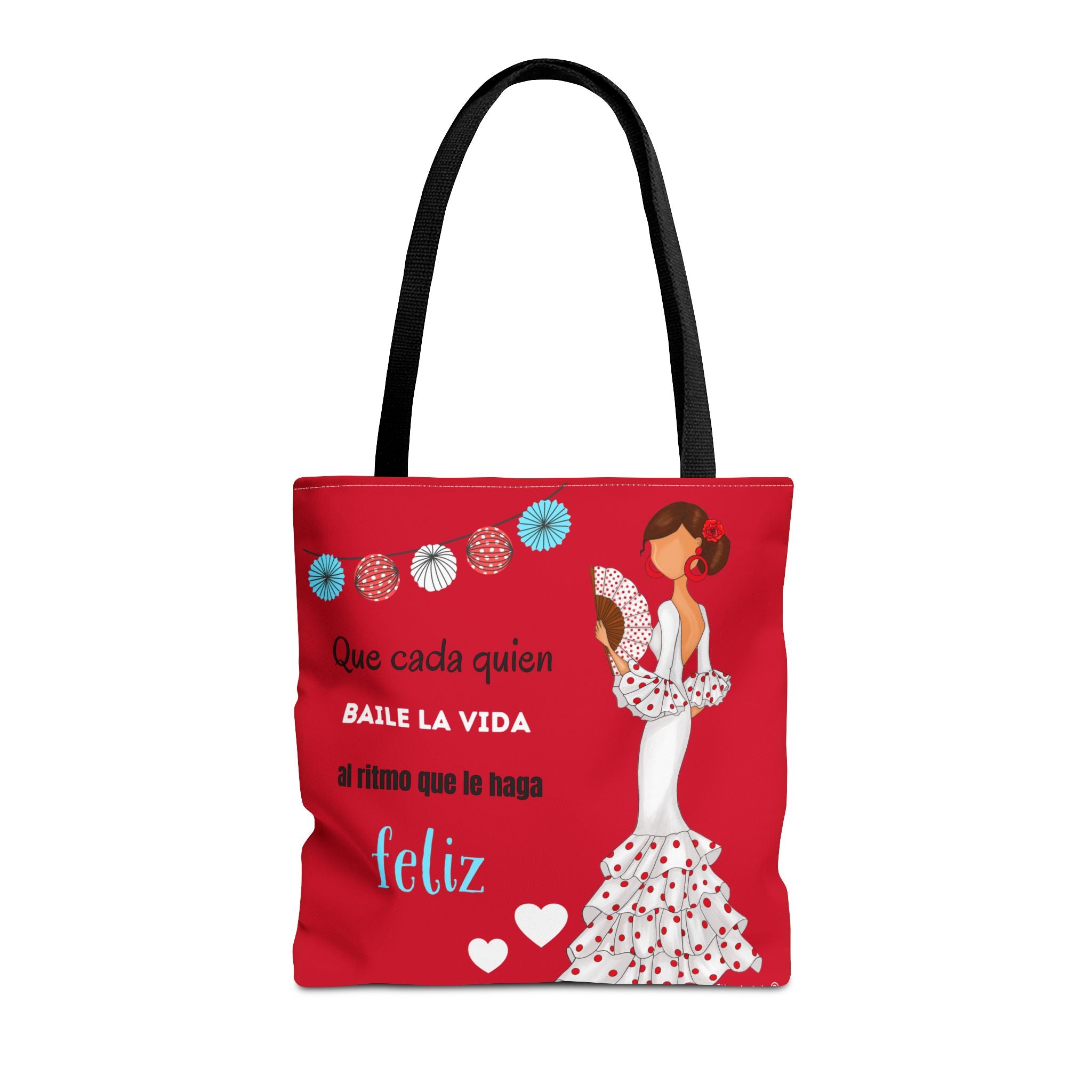 👜 illustrArte Bolsa Tote Málaga Diseño Flamenca “Pepa Feliz” Rojo con Frase “Que cada quien baile la vida al ritmo que le haga feliz” | Poliéster 400 g/m² (43 x 43 cm) | Impresión a Doble Cara | Asas de 60 cm | Bolso Shopper Resistente