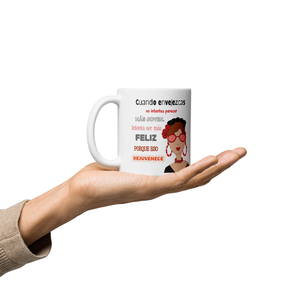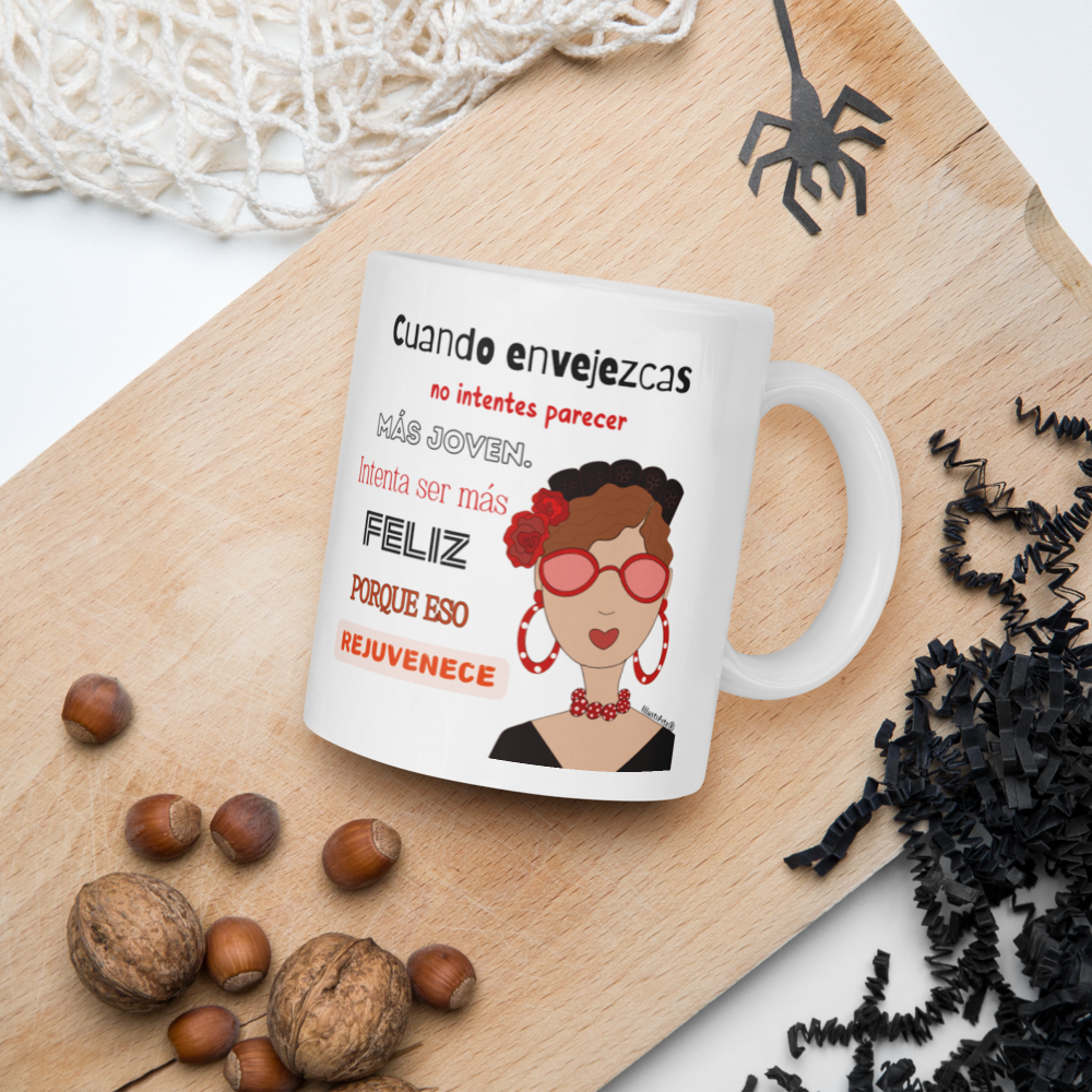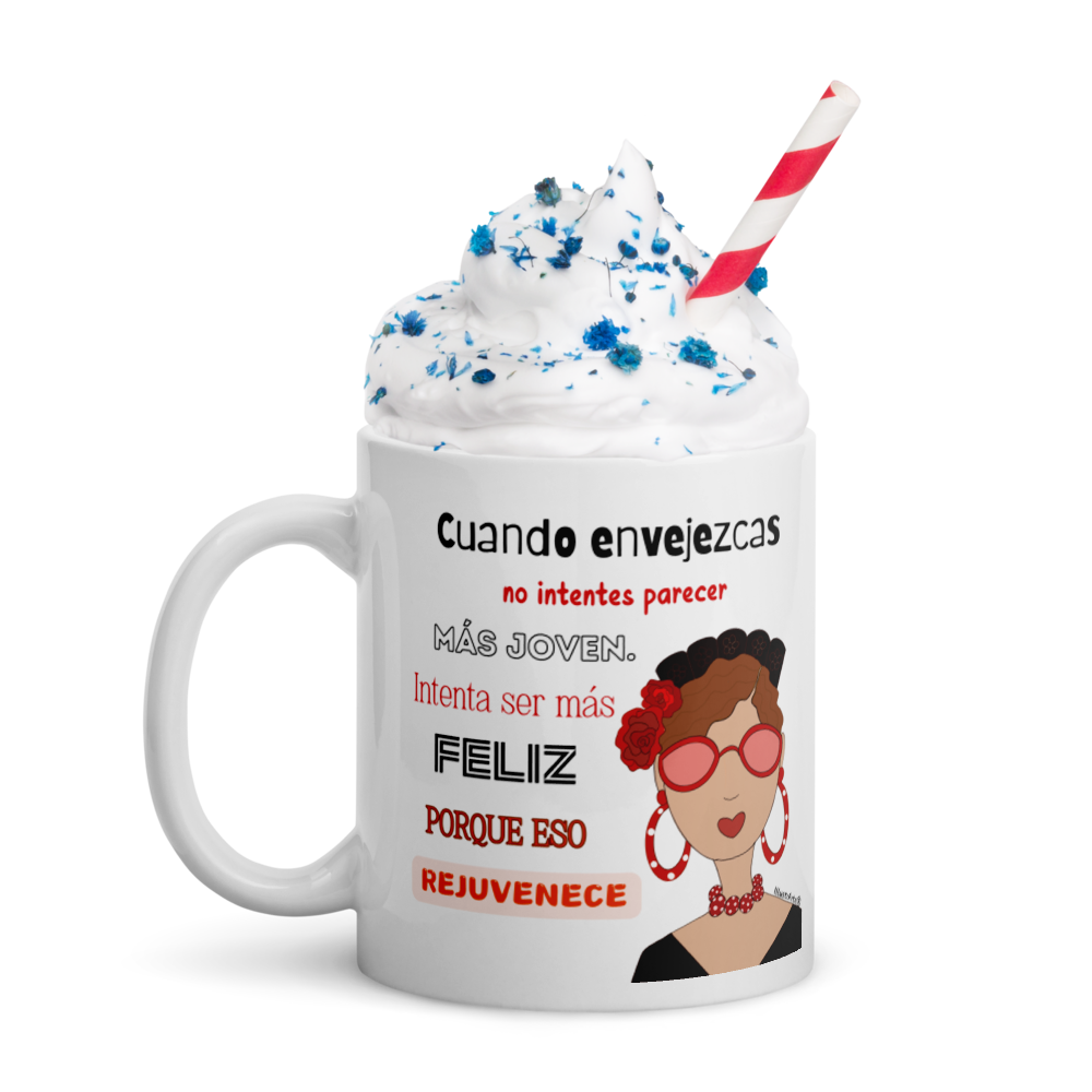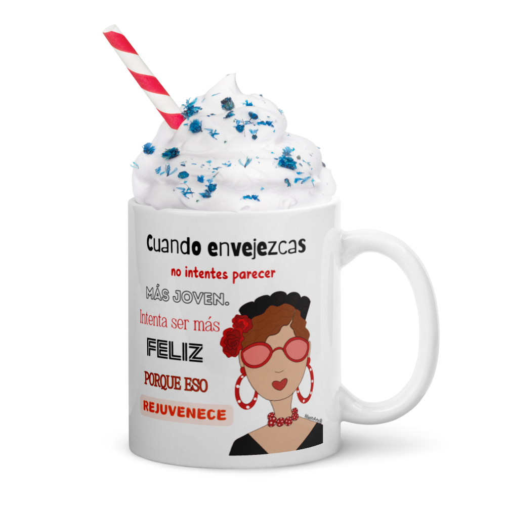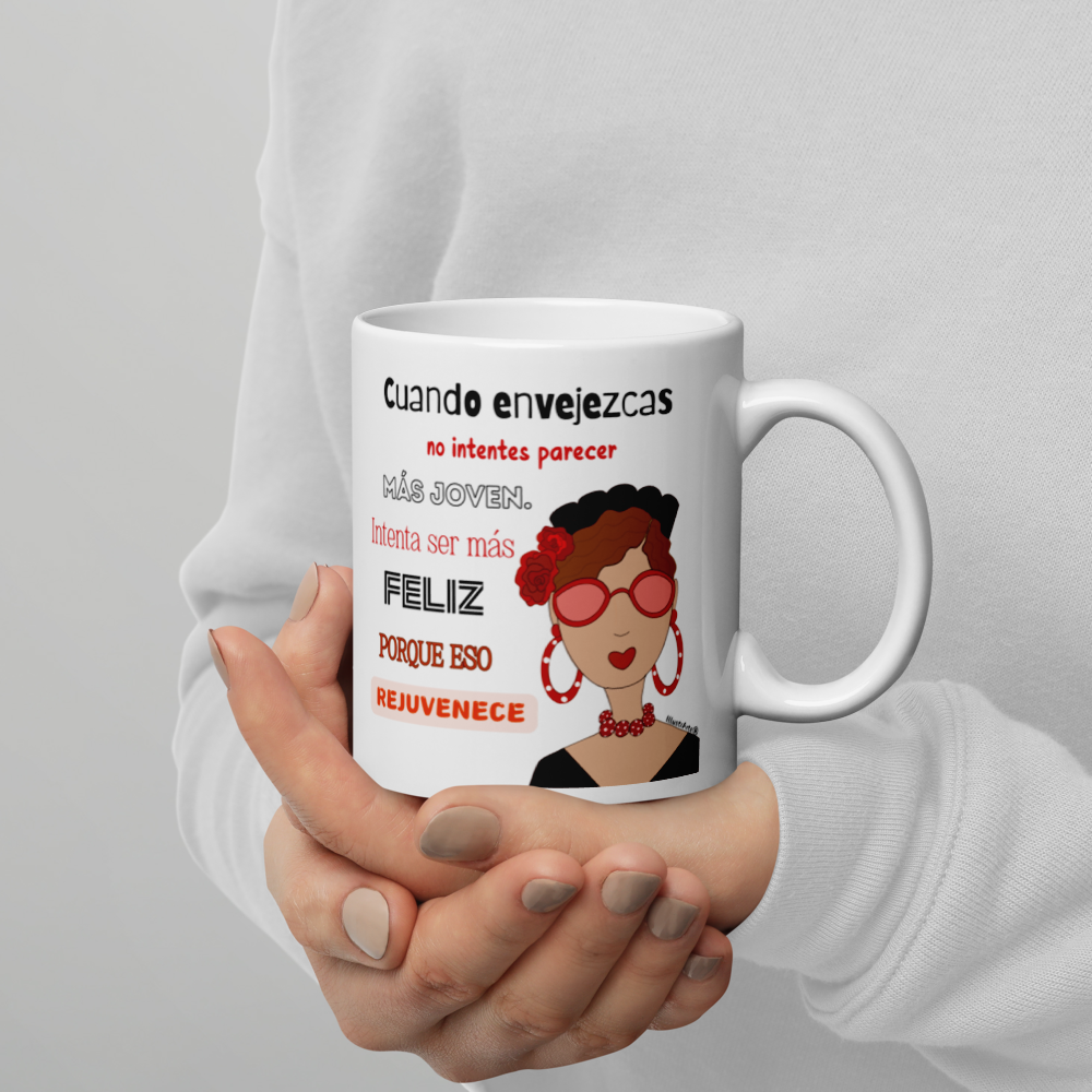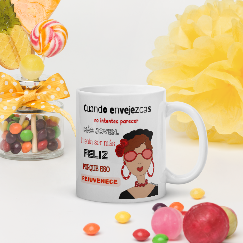Taza de cerámica, Modelo flamenca con gafas y frase positiva.