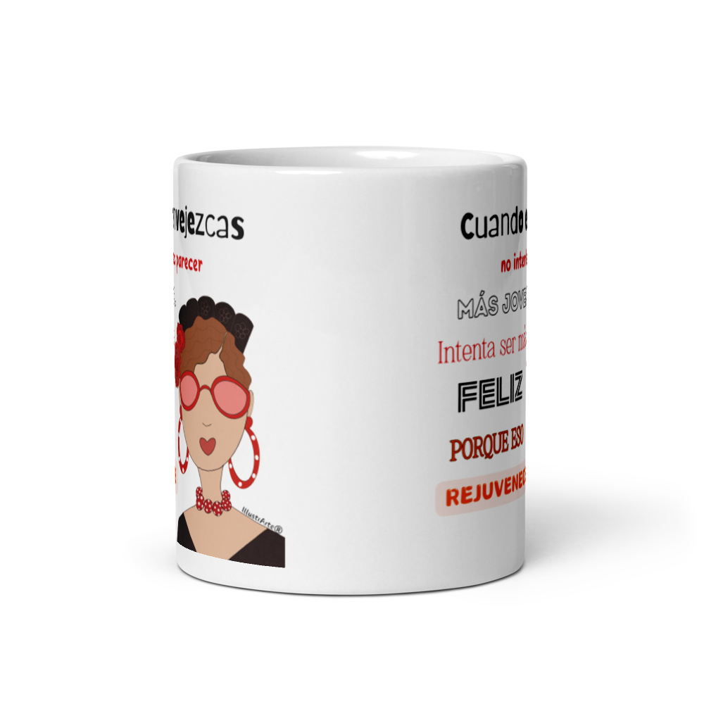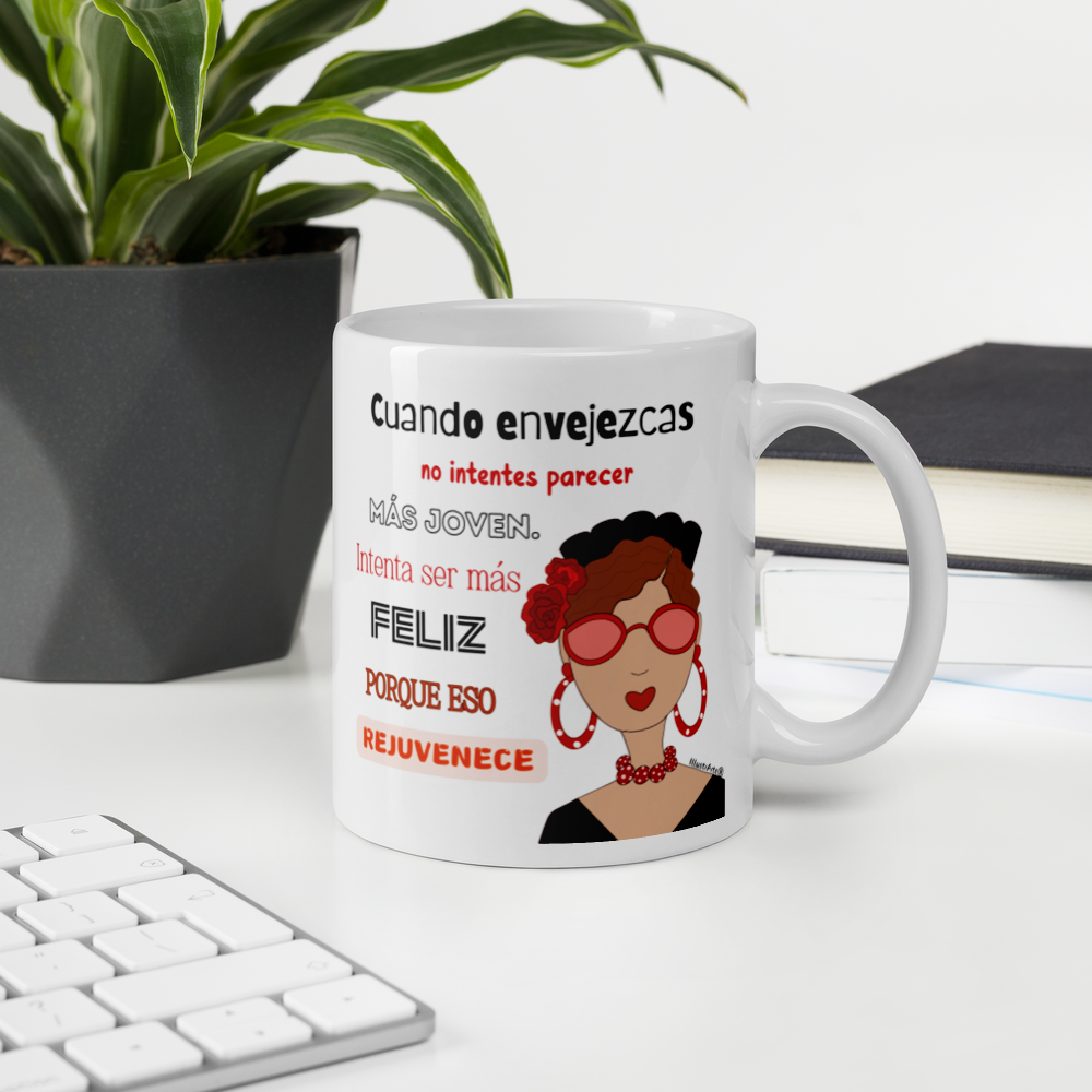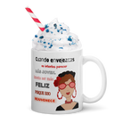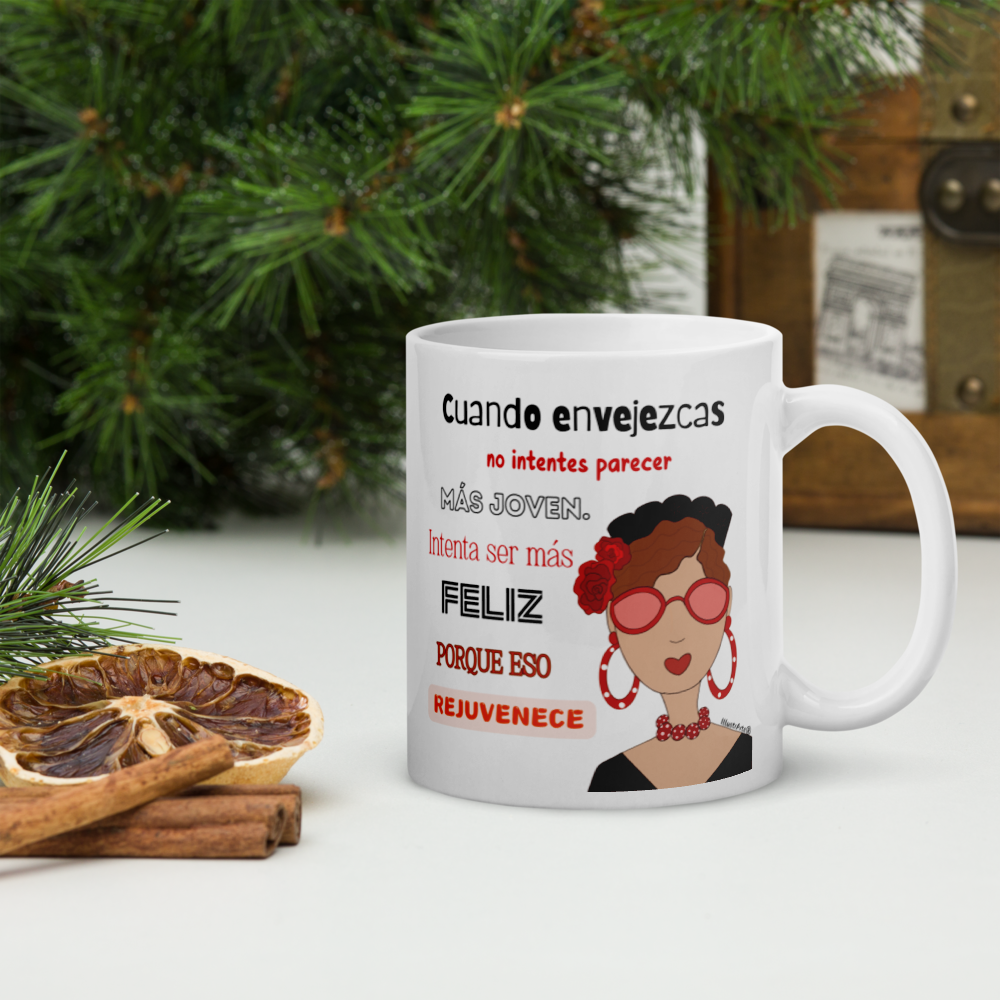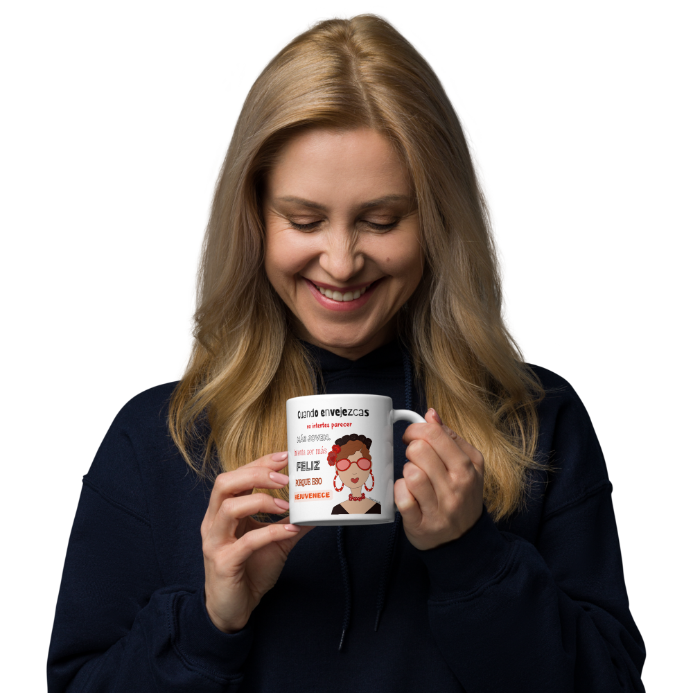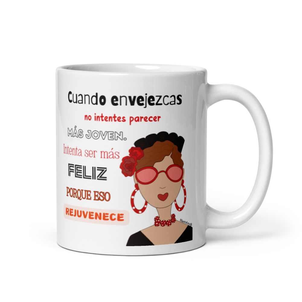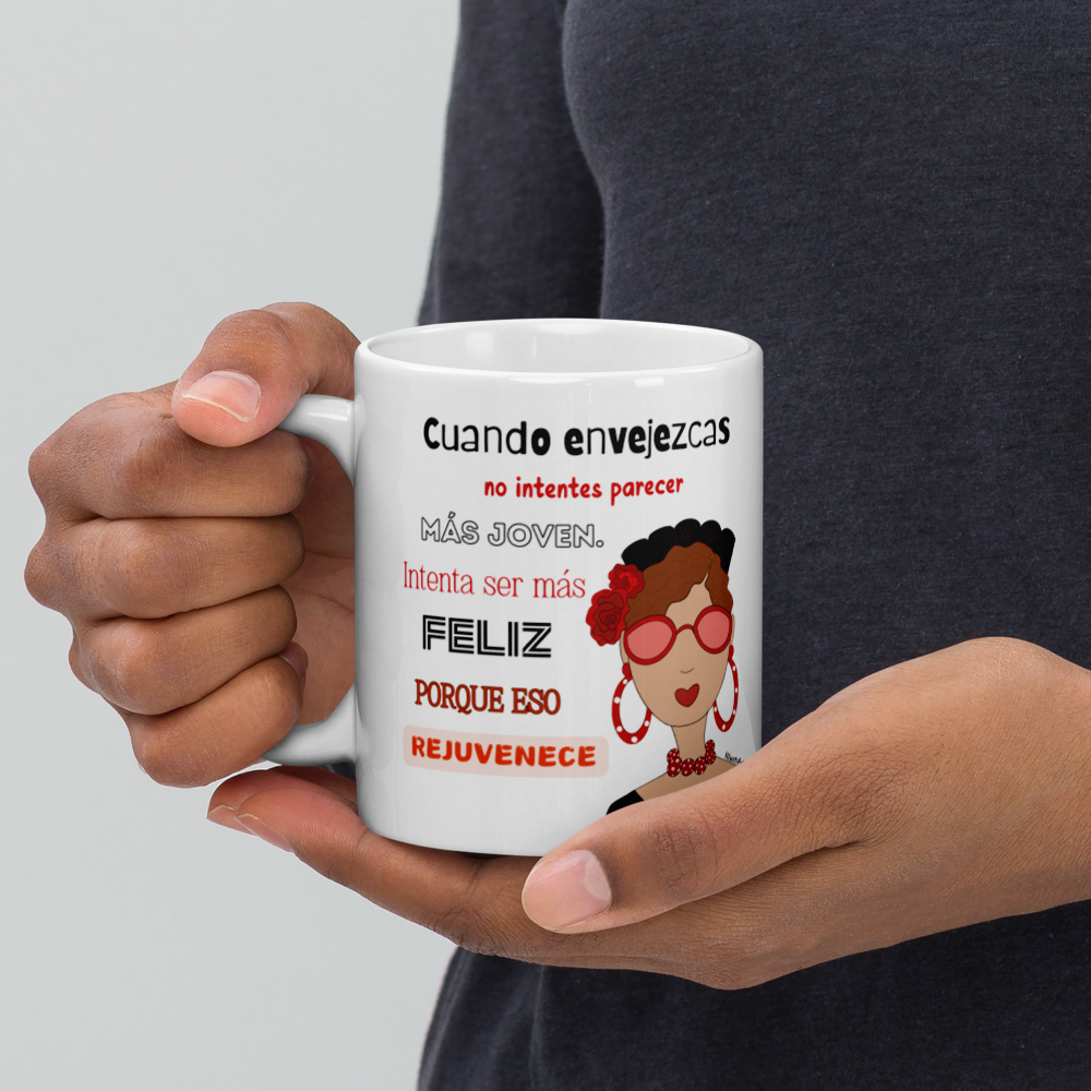Taza de cerámica, Modelo flamenca con gafas y frase positiva.