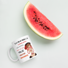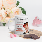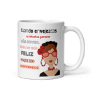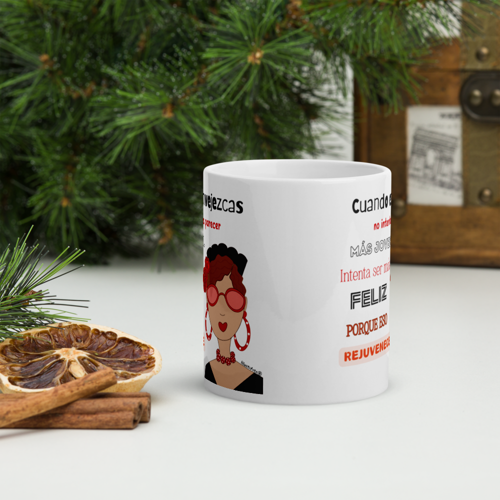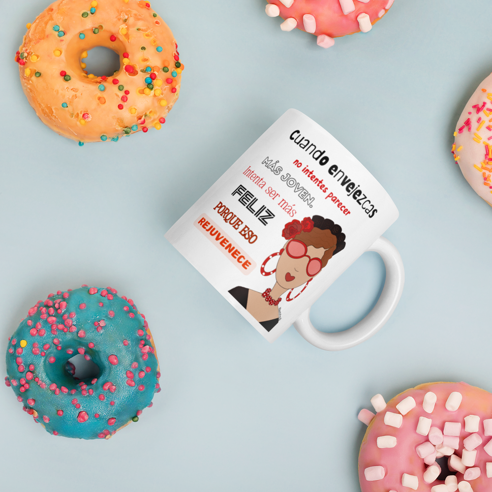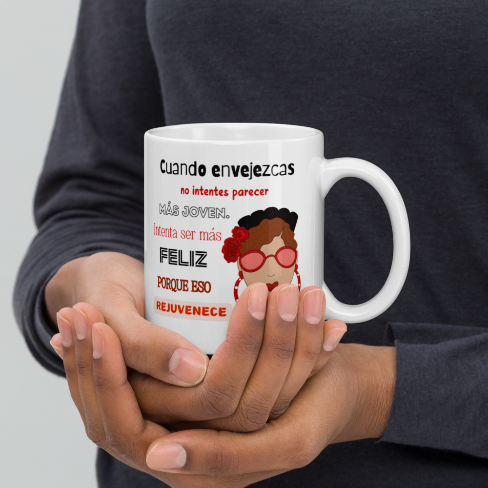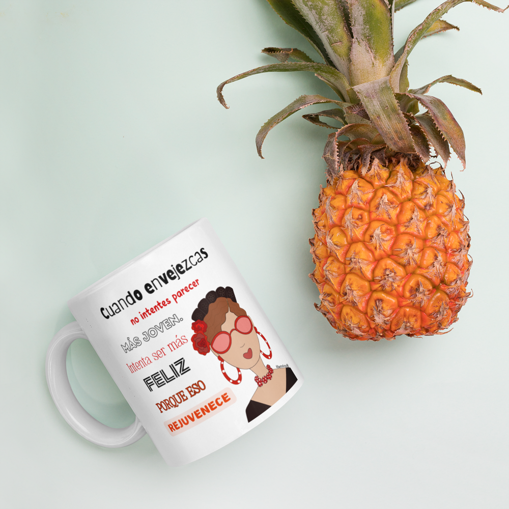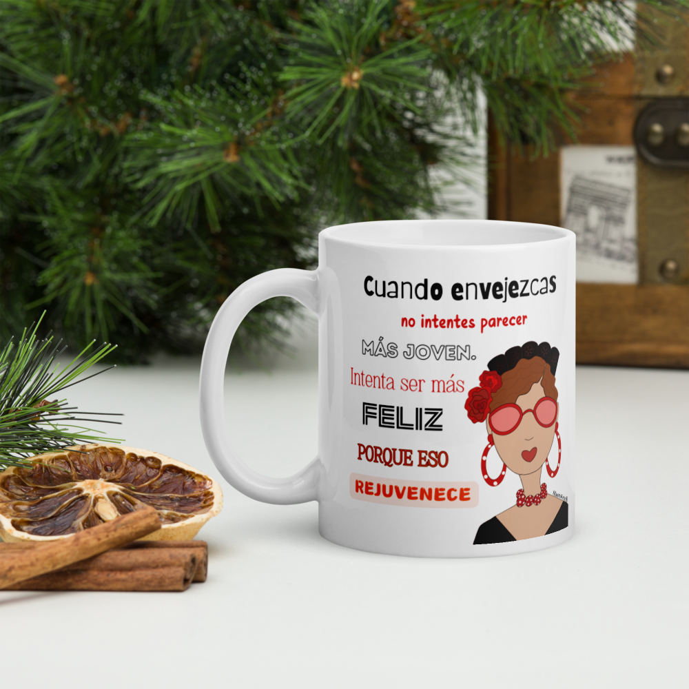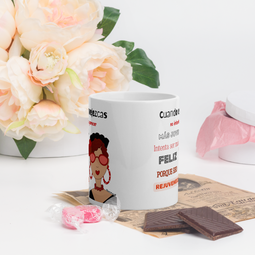 Taza de cerámica, Modelo flamenca con gafas y frase positiva.