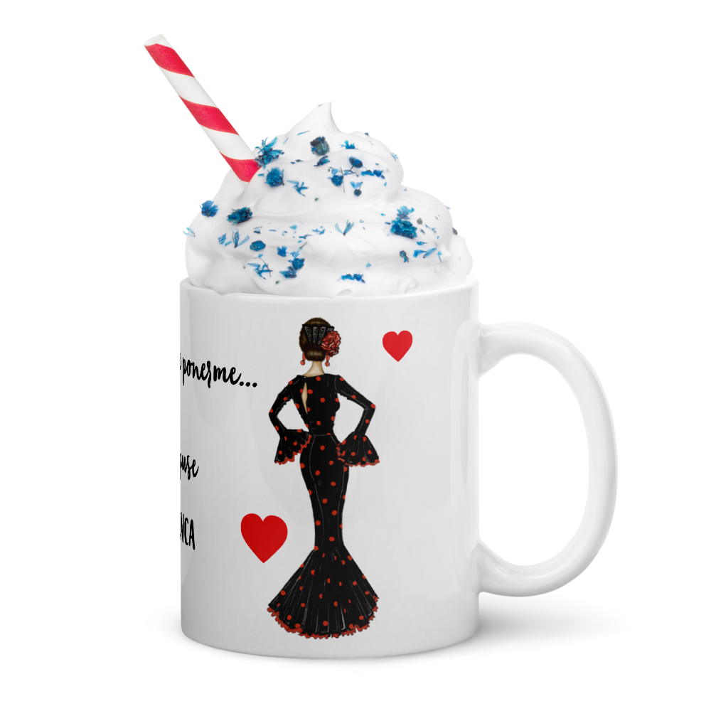 Taza de cerámica personalizable, Modelo flamenca María negro con lunar rojo