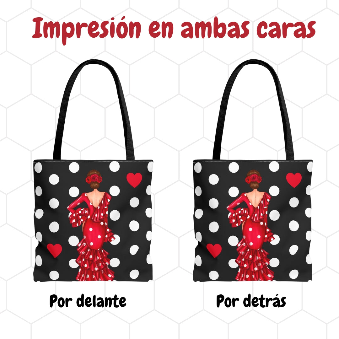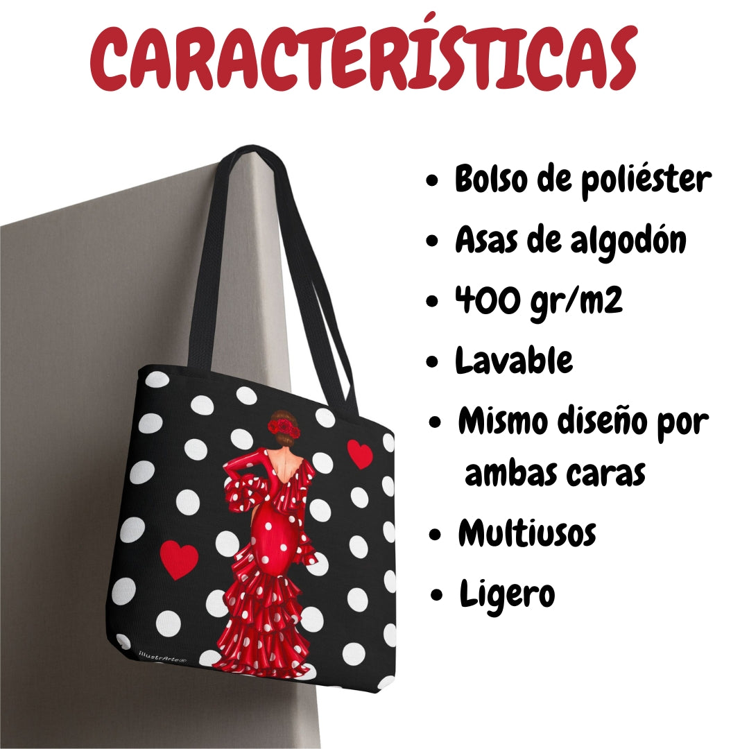 👜 illustrArte Bolsa Tote Málaga Diseño Flamenca “Macarena” Negro con Lunares | Poliéster 400 g/m² (43 x 43 cm) | Impresión a Doble Cara | Asas de 60 cm | Bolso Shopper Resistente