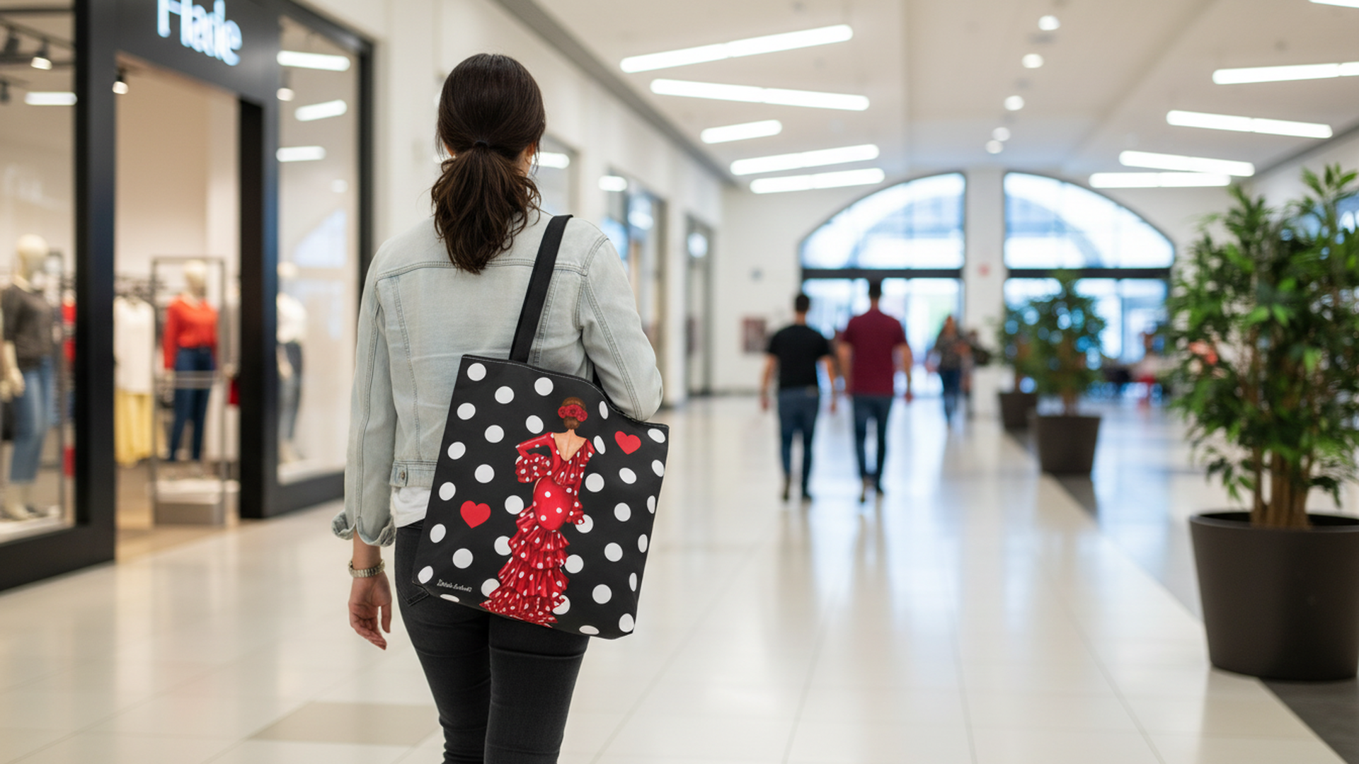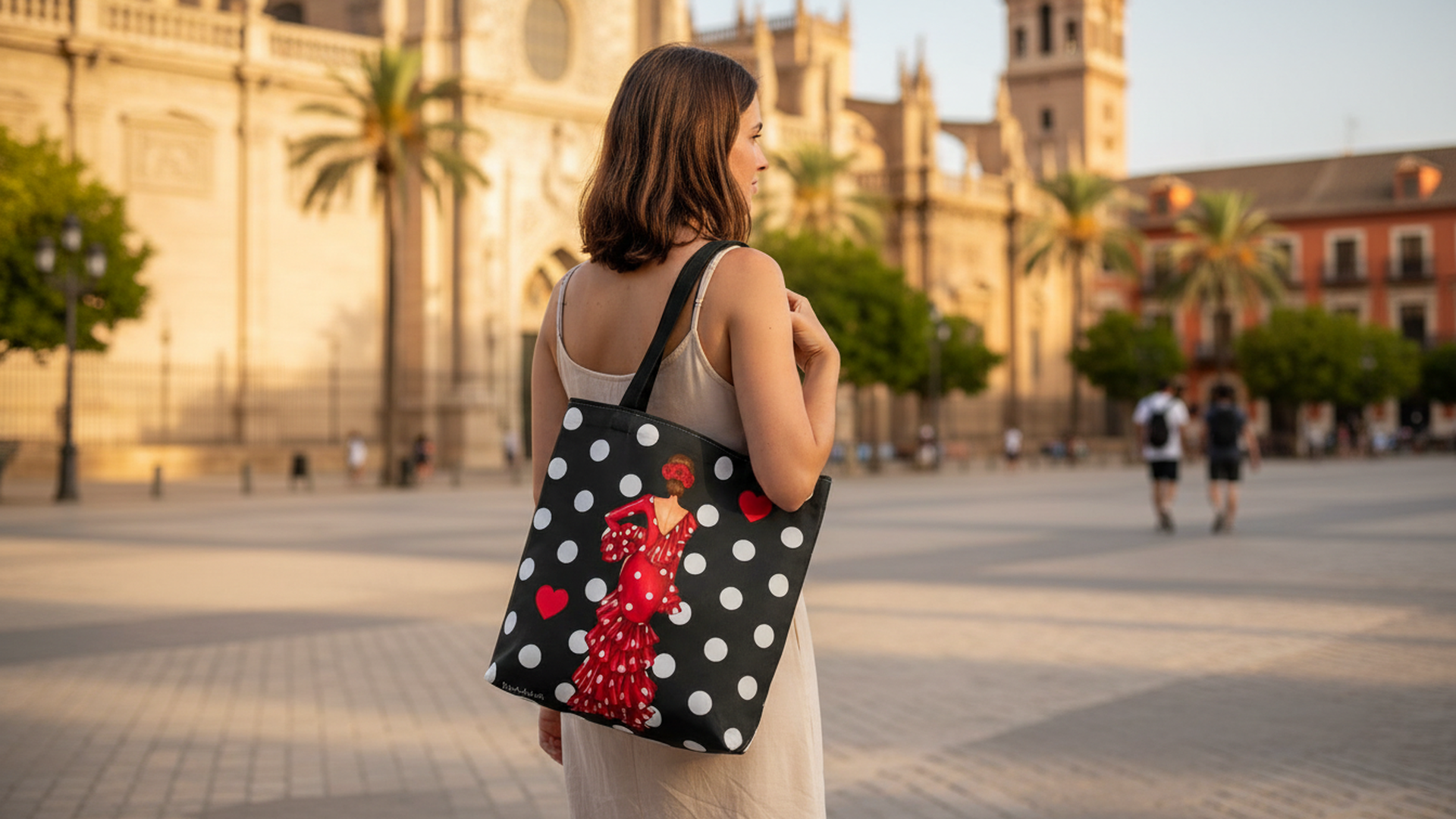 Esta bolsa tote illustrArte celebra la fuerza y el carácter del estilo flamenco. Con el elegante diseño de la flamenca Macarena sobre fondo negro con lunares blancos y detalles en rojo, es una pieza llena de personalidad que no pasa desapercibida.