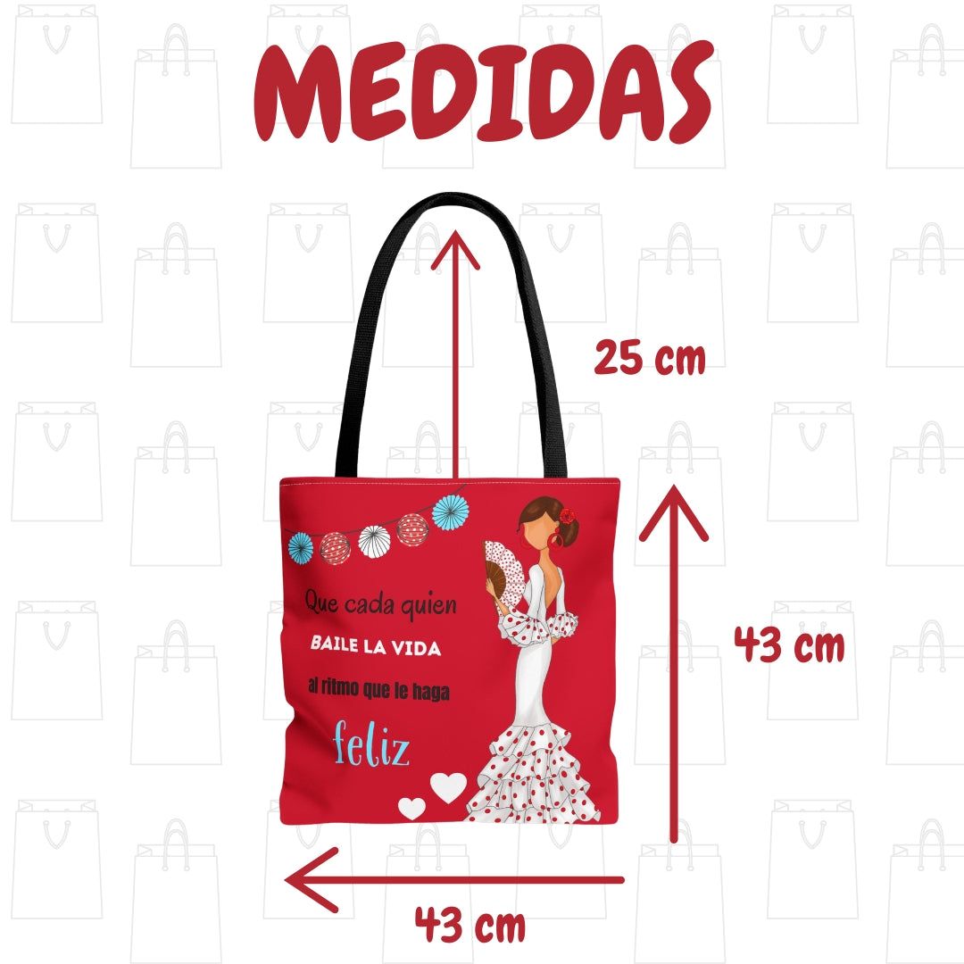 👜 illustrArte Bolsa Tote Málaga Diseño Flamenca “Pepa Feliz” Rojo con Frase “Que cada quien baile la vida al ritmo que le haga feliz” | Poliéster 400 g/m² (43 x 43 cm) | Impresión a Doble Cara | Asas de 60 cm | Bolso Shopper Resistente