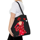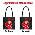 Esta bolsa tote illustrArte presenta el diseño de la flamenca Macarena, vestida de rojo con lunares sobre fondo negro. Una imagen icónica, femenina y poderosa, pensada para quienes llevan el arte y el carácter flamenco por bandera.