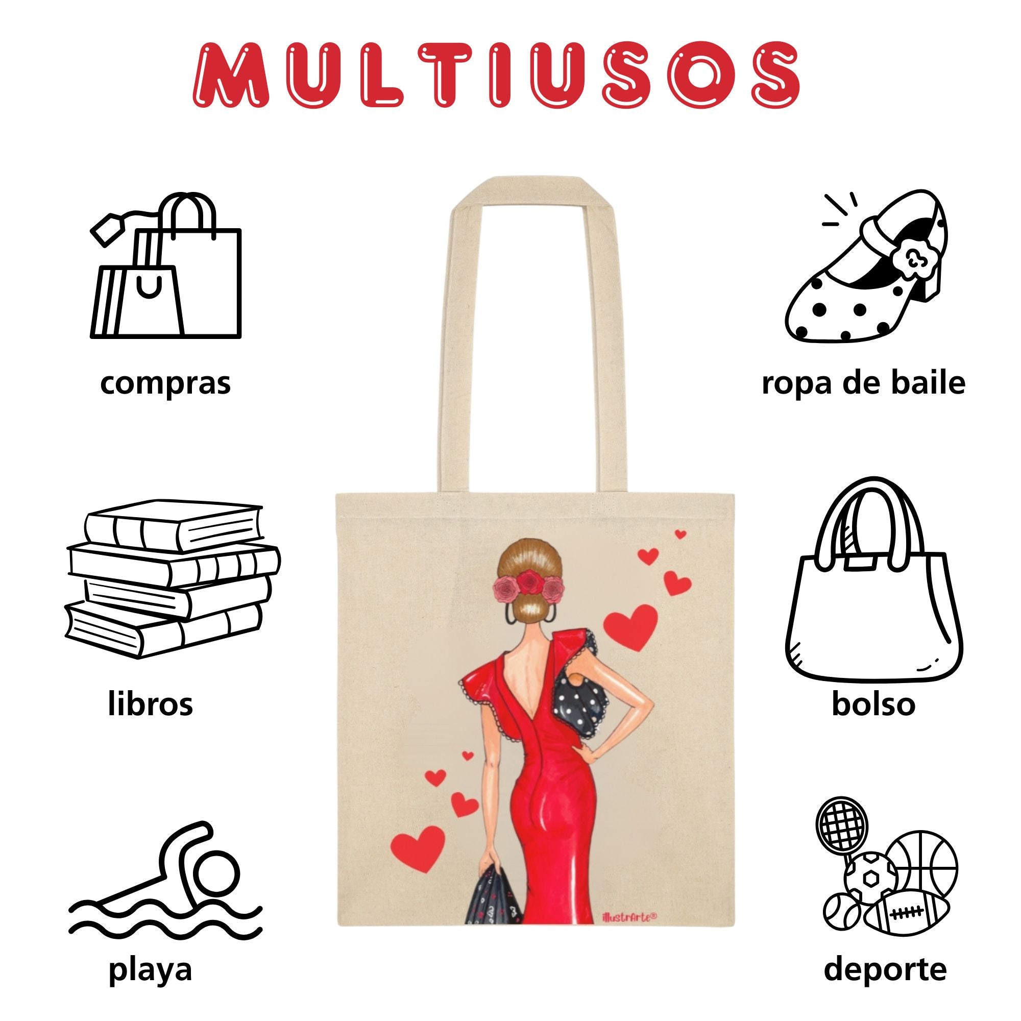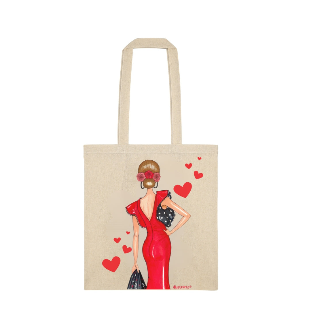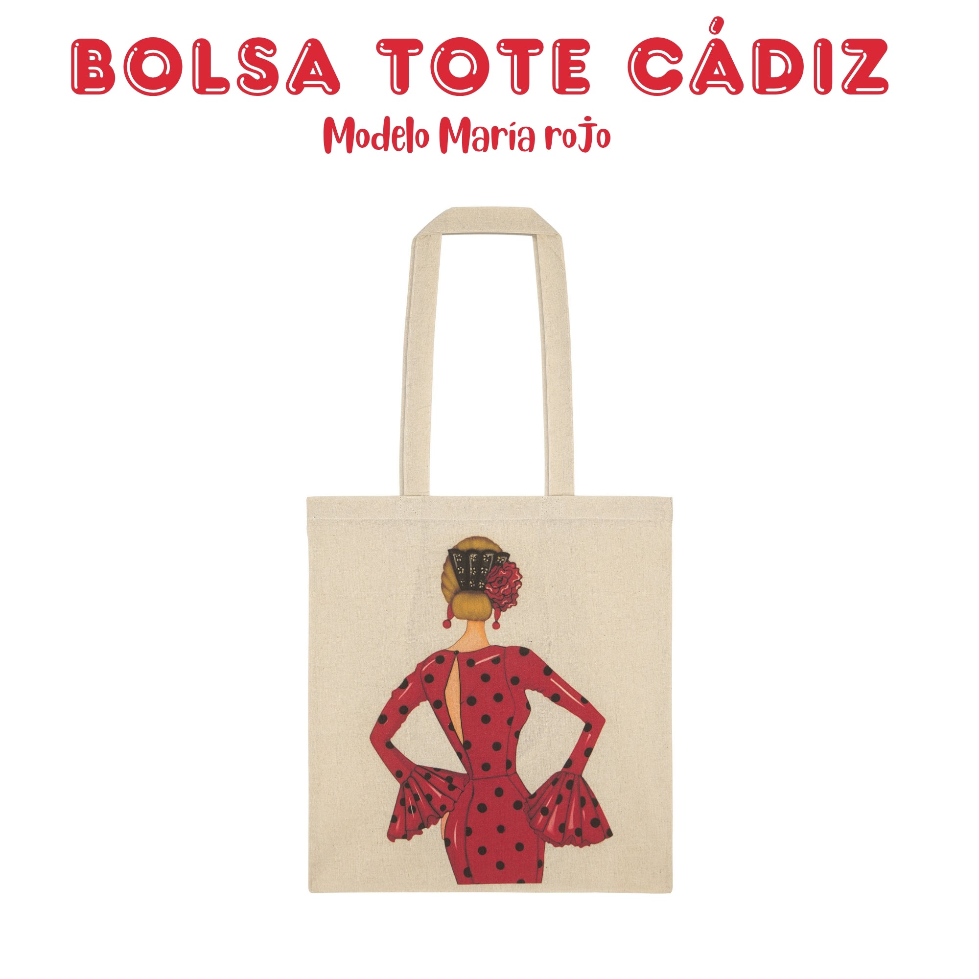 👜 illustrArte Bolsa Tote Cádiz Diseño Flamenca “María Rojo” | Algodón 135 g/m² (38 x 42 cm) | Asas Largas de 60 cm | Impresión en un Lado | Bolso Shopper Ligero (Soporta hasta 5 kg)