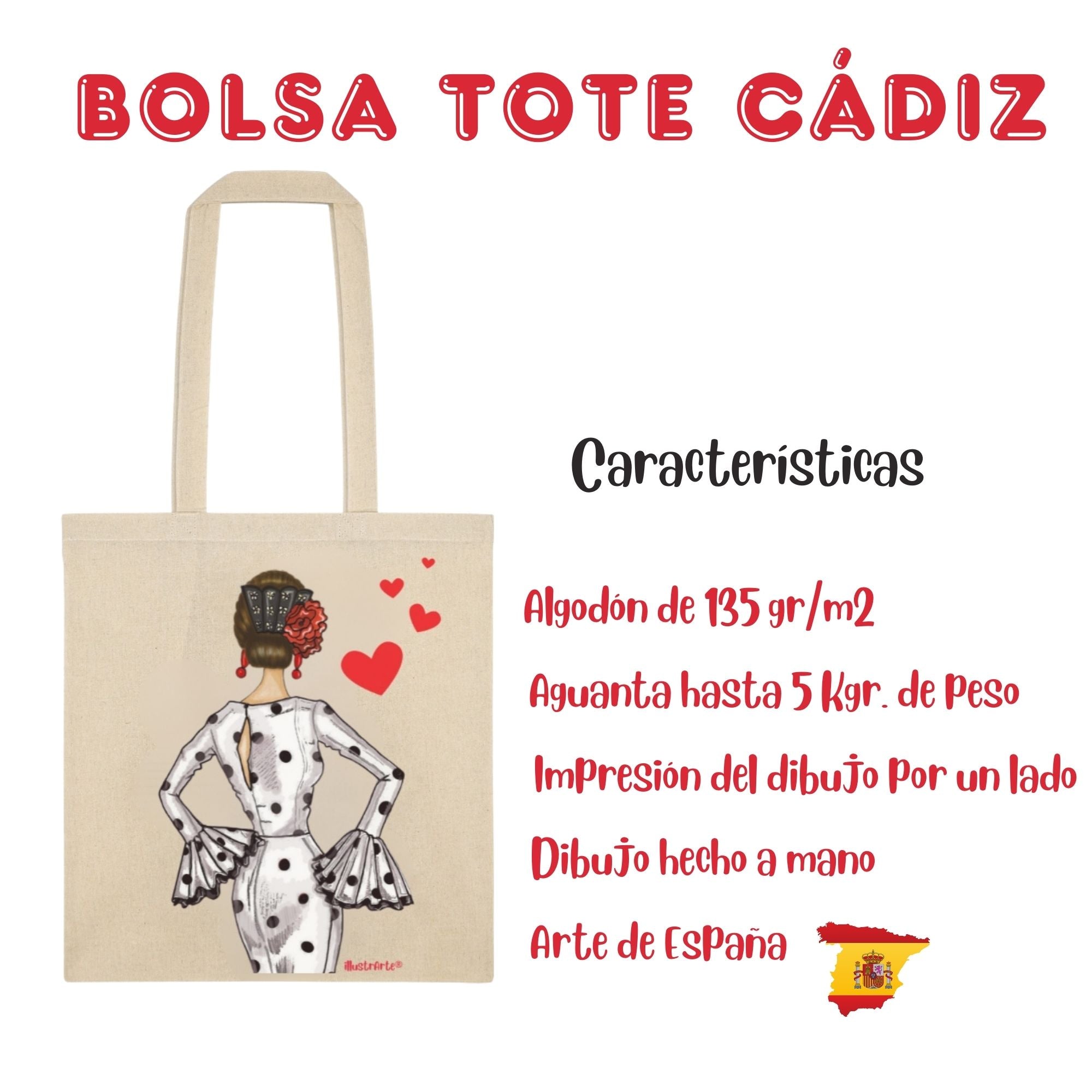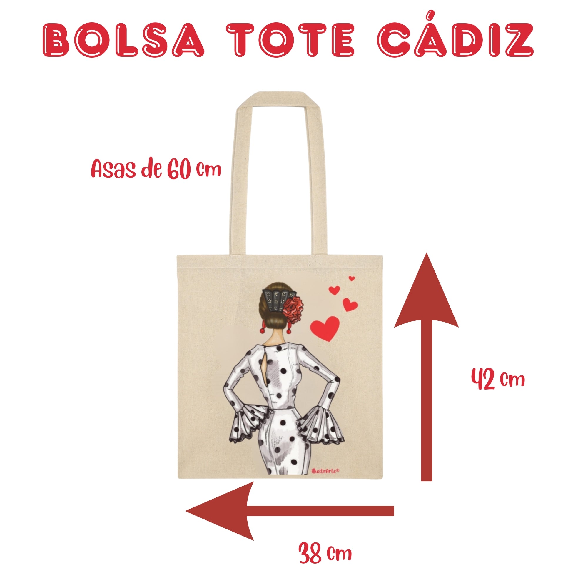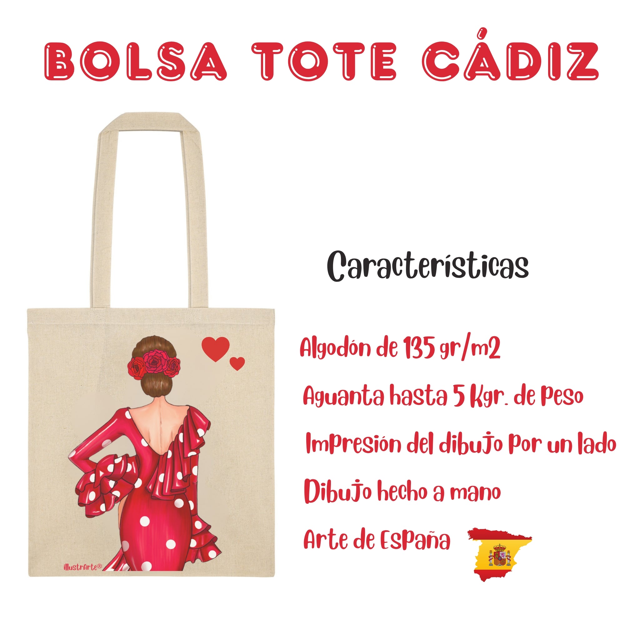 👜 illustrArte Bolsa Tote Cádiz Diseño Flamenca “Macarena” | Algodón 135 g/m² (38 x 42 cm) | Asas Largas de 60 cm | Impresión en un Lado | Bolso Shopper Ligero (Soporta hasta 5 kg)