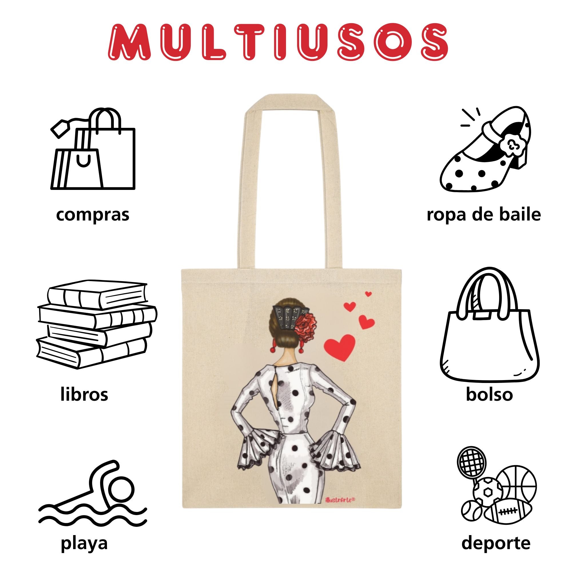 👜 illustrArte Bolsa Tote Cádiz Diseño Flamenca “Manuela” | Algodón 135 g/m² (38 x 42 cm) | Asas Largas de 60 cm | Impresión en un Lado | Bolso Shopper Ligero (Soporta hasta 5 kg)