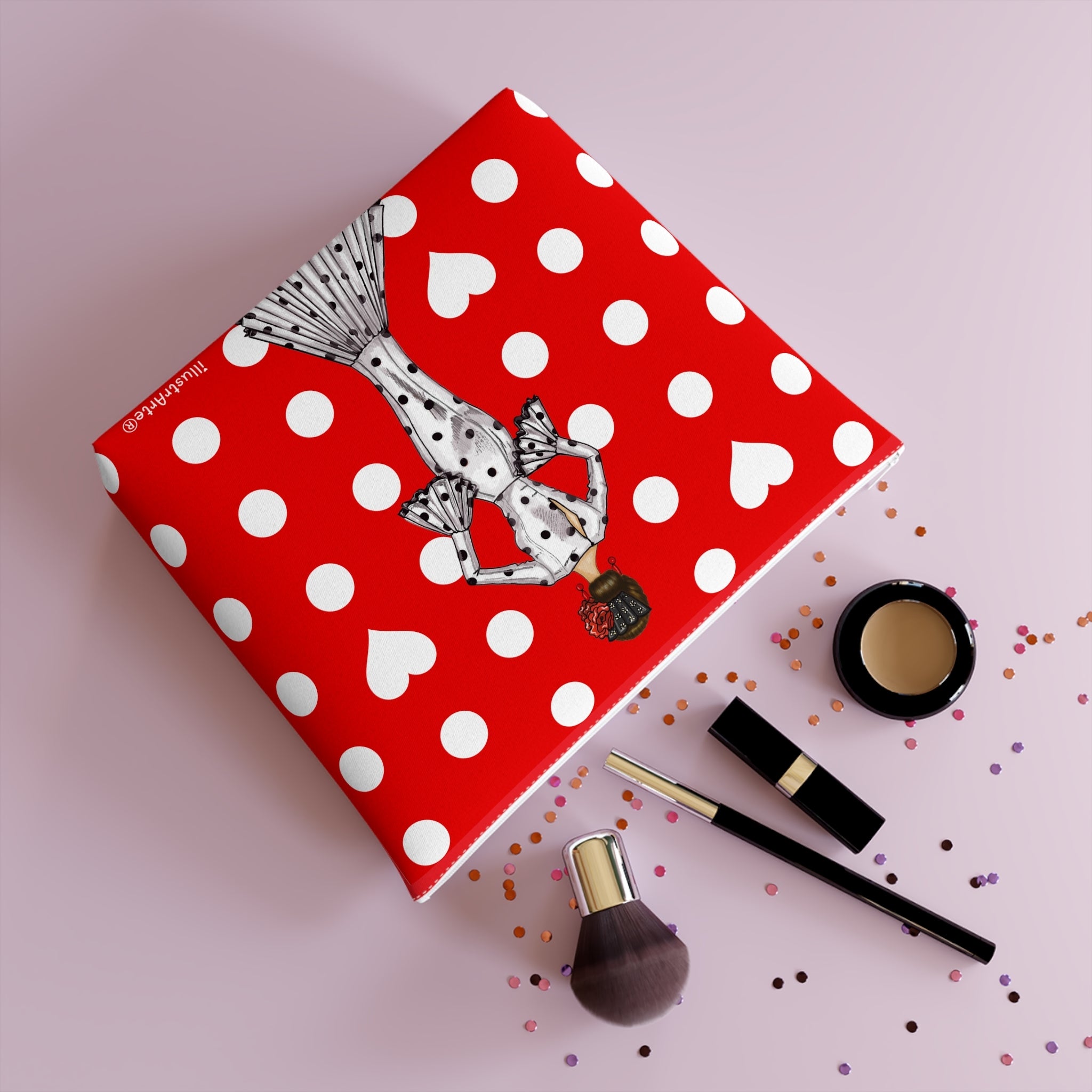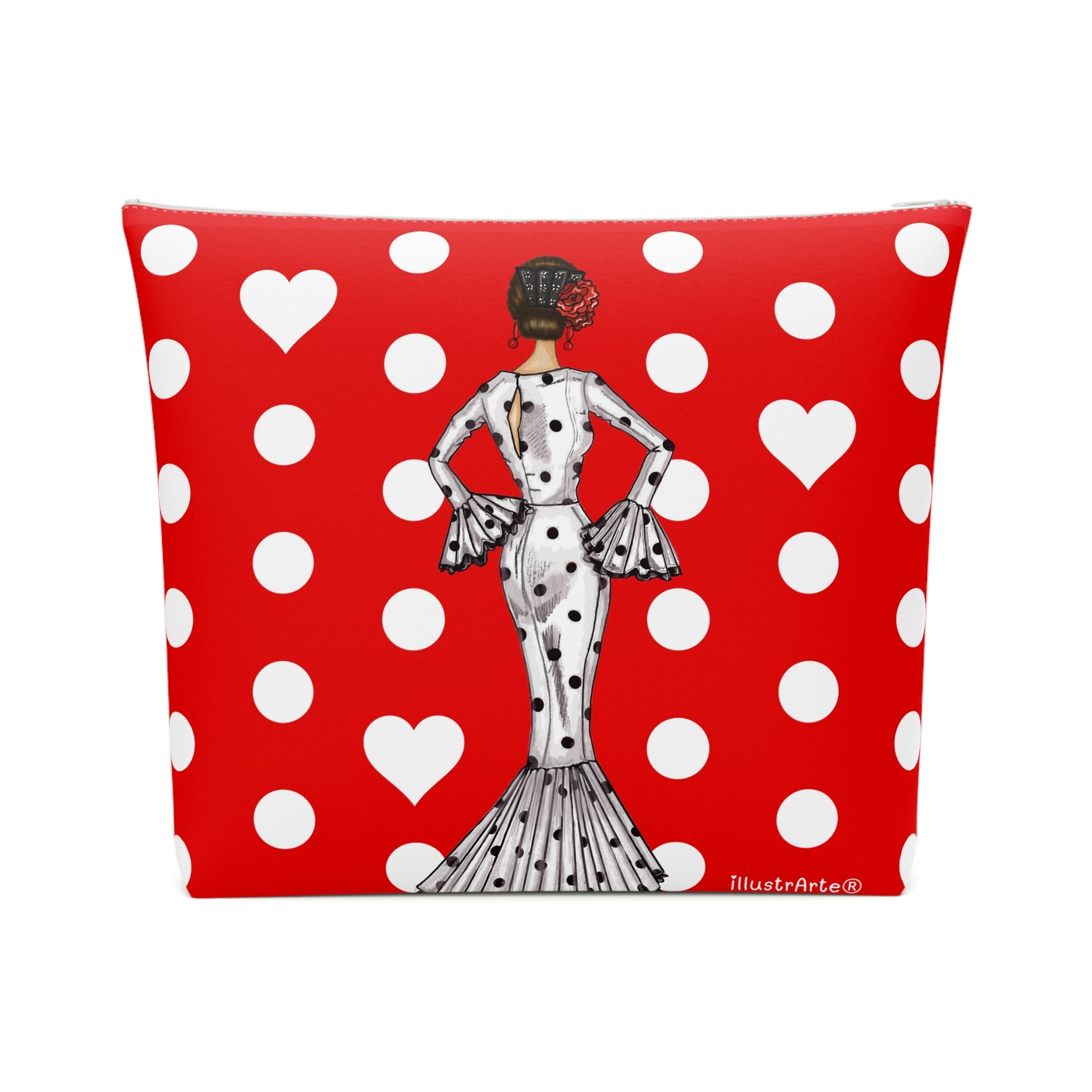 Descubre el espíritu flamenco con nuestro neceser “Sevilla – María blanco”, un diseño exclusivo de IllustrArte que celebra la fuerza y la elegancia de la mujer andaluza. La ilustración está impresa a doble cara, con un fondo rojo vibrante decorado con clásicos lunares blancos, aportando alegría y carácter a tu rutina diaria o a tus viajes.