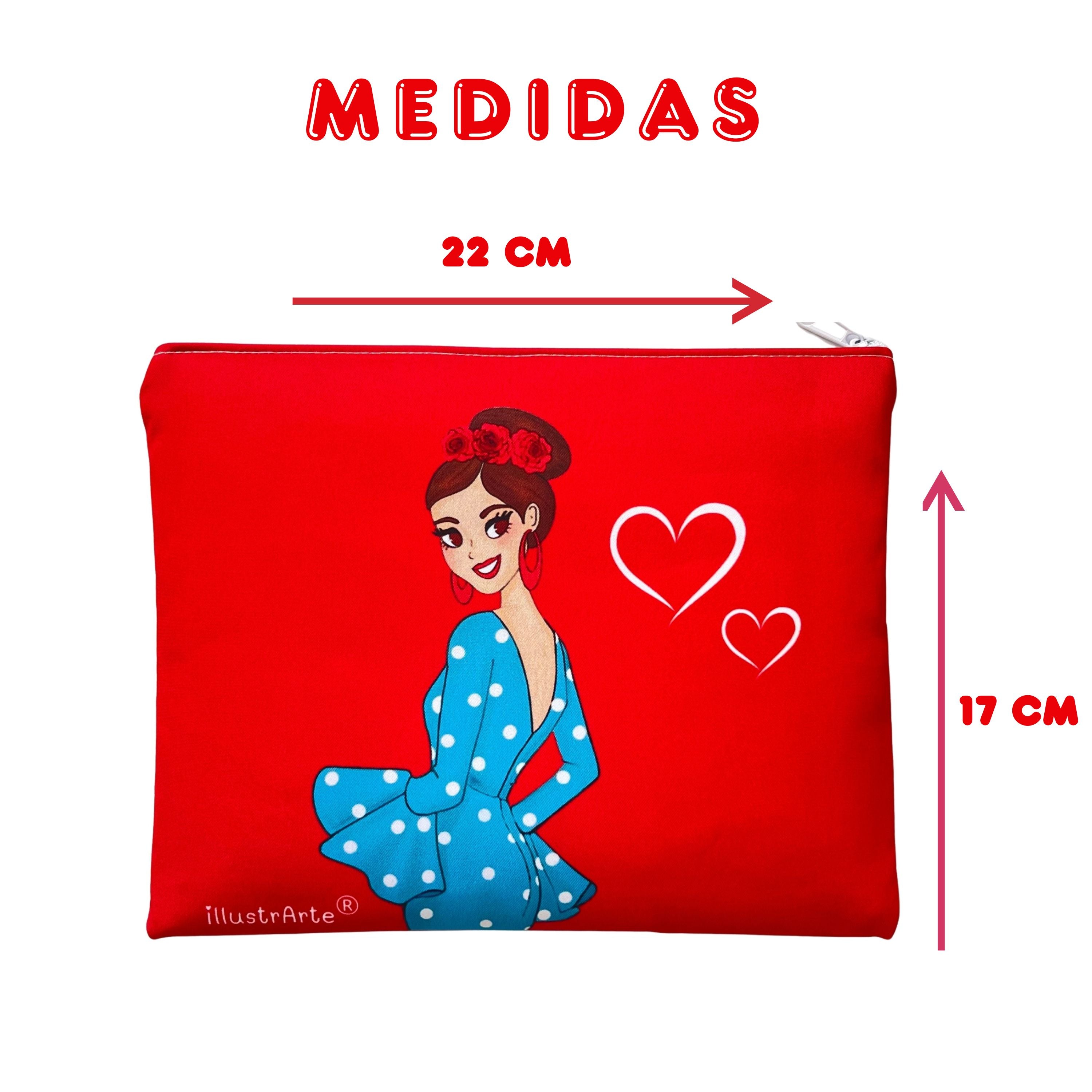 Neceser o Estuche Granada Flamenca “Paquita” – Diseño Doble Cara – Fondo Rojo con corazones – 22x17 cm – Impermeable – Bolsa de Aseo, Maquillaje o Material Escolar