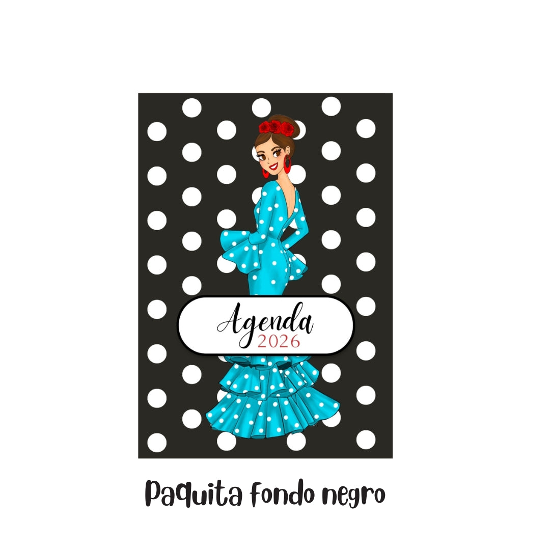 Agenda Flamenca 2026 “Paquita fondo negro” – 2 Días por Página – Ilustraciones Flamencas – Eventos Flamencos del Año – Diseño illustrArte