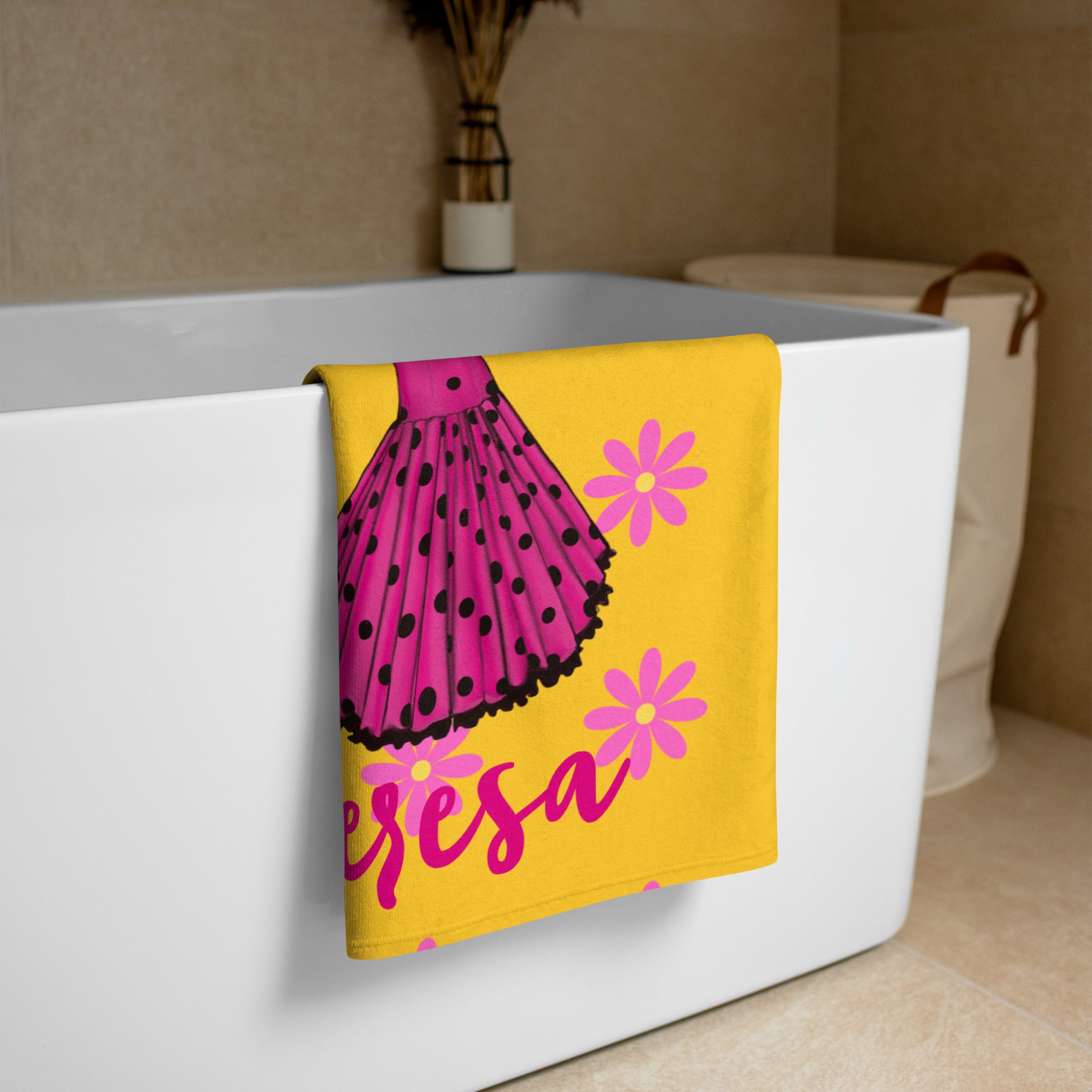 Toalla De Playa Personalizable - Modelo Flamenca María con vestido rosa y flores