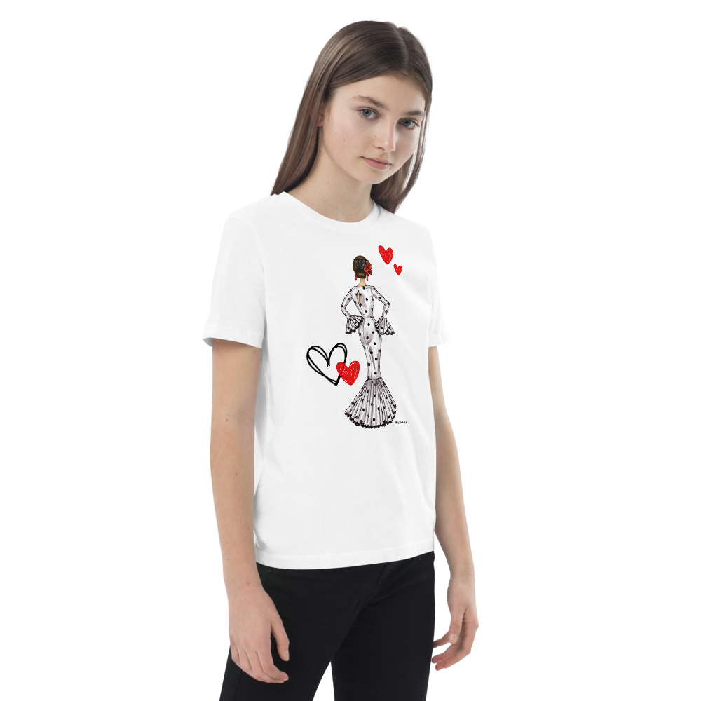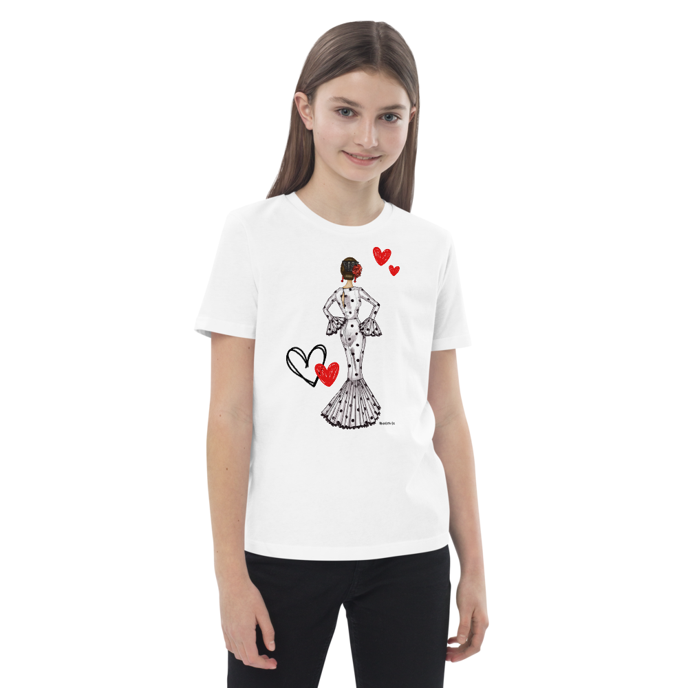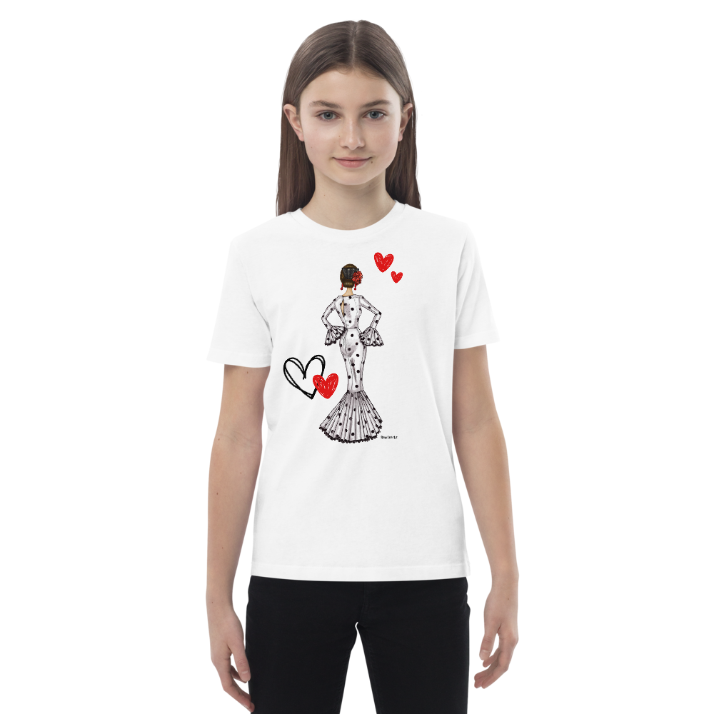 Descubre la elegancia y la frescura de nuestra camiseta flamenca de algodón orgánico para niñas, diseñada para edades de 3 a 12 años.