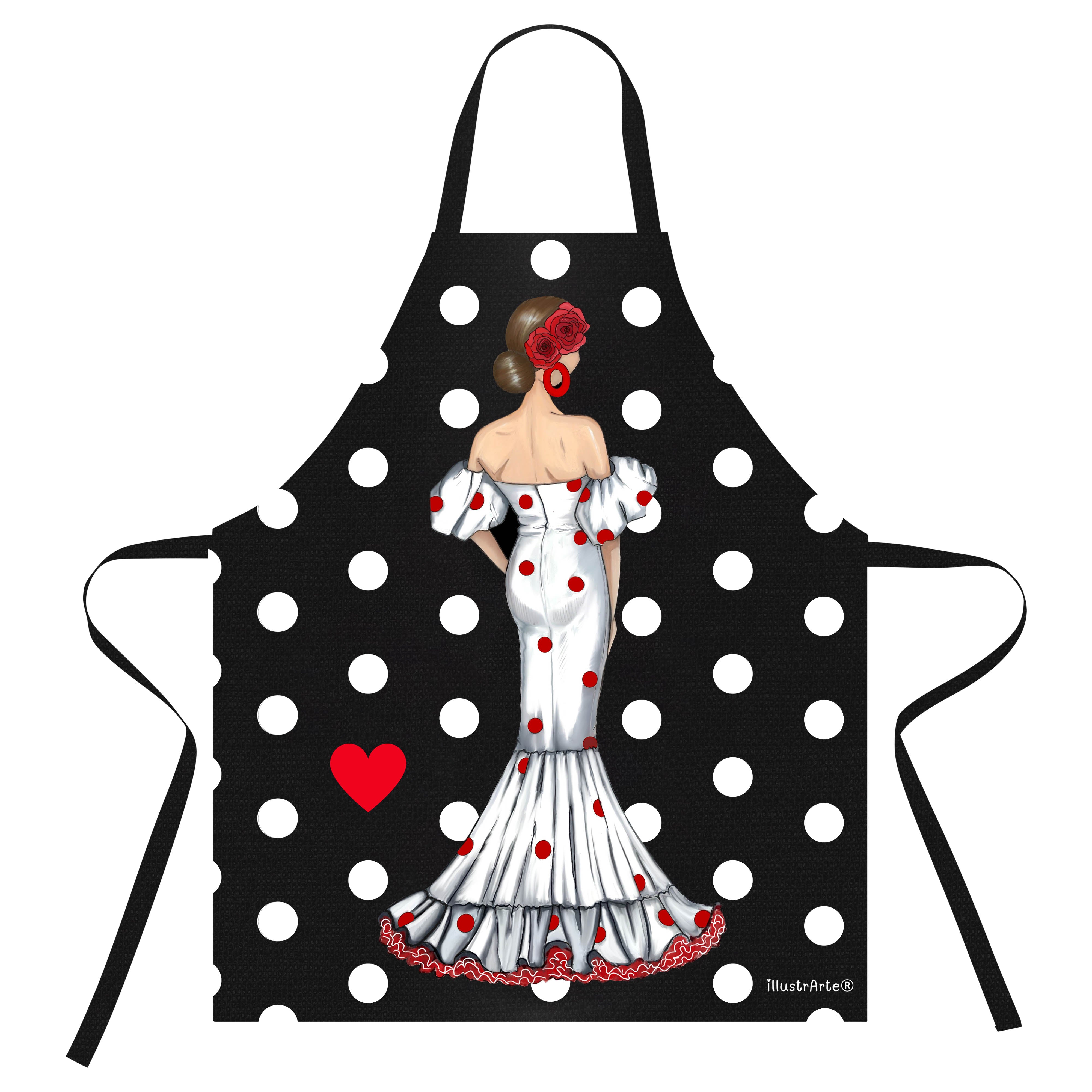 Transform your culinary experience with our charming flamenco apron - Maria in white dress. At IllustrArte, we consider the kitchen to be a place where creativity and joy should flourish. This apron is not only an accessory, but a declaration of love for flamenco culture, adding a vibrant and colorful touch to your moments in the kitchen.
