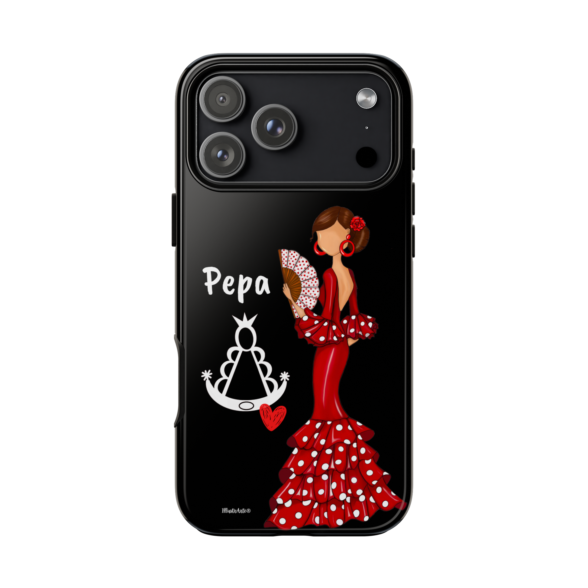 Personalized Pepa phone case on a black background with the Virgin Mary – for iPhone, Samsung, Pixel
