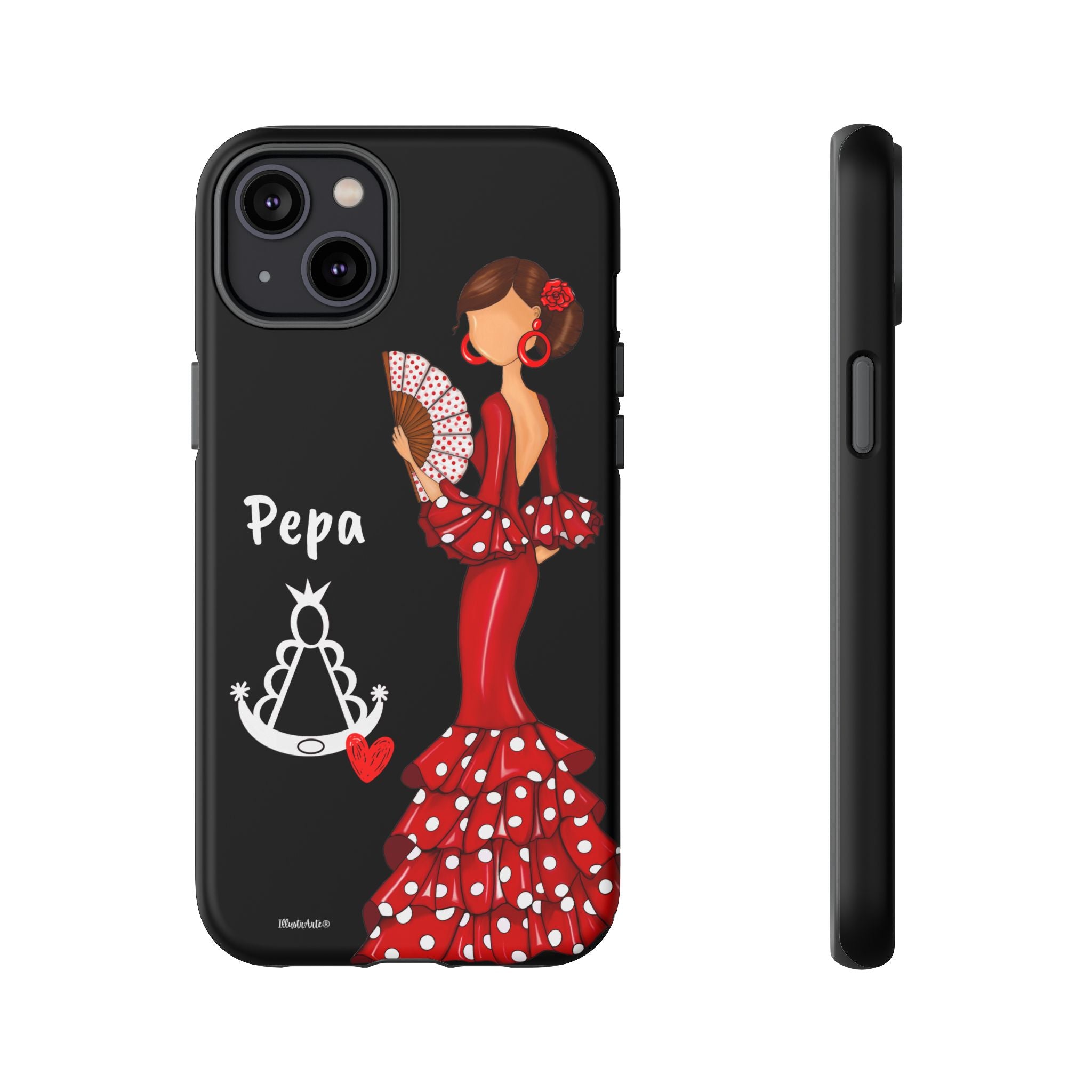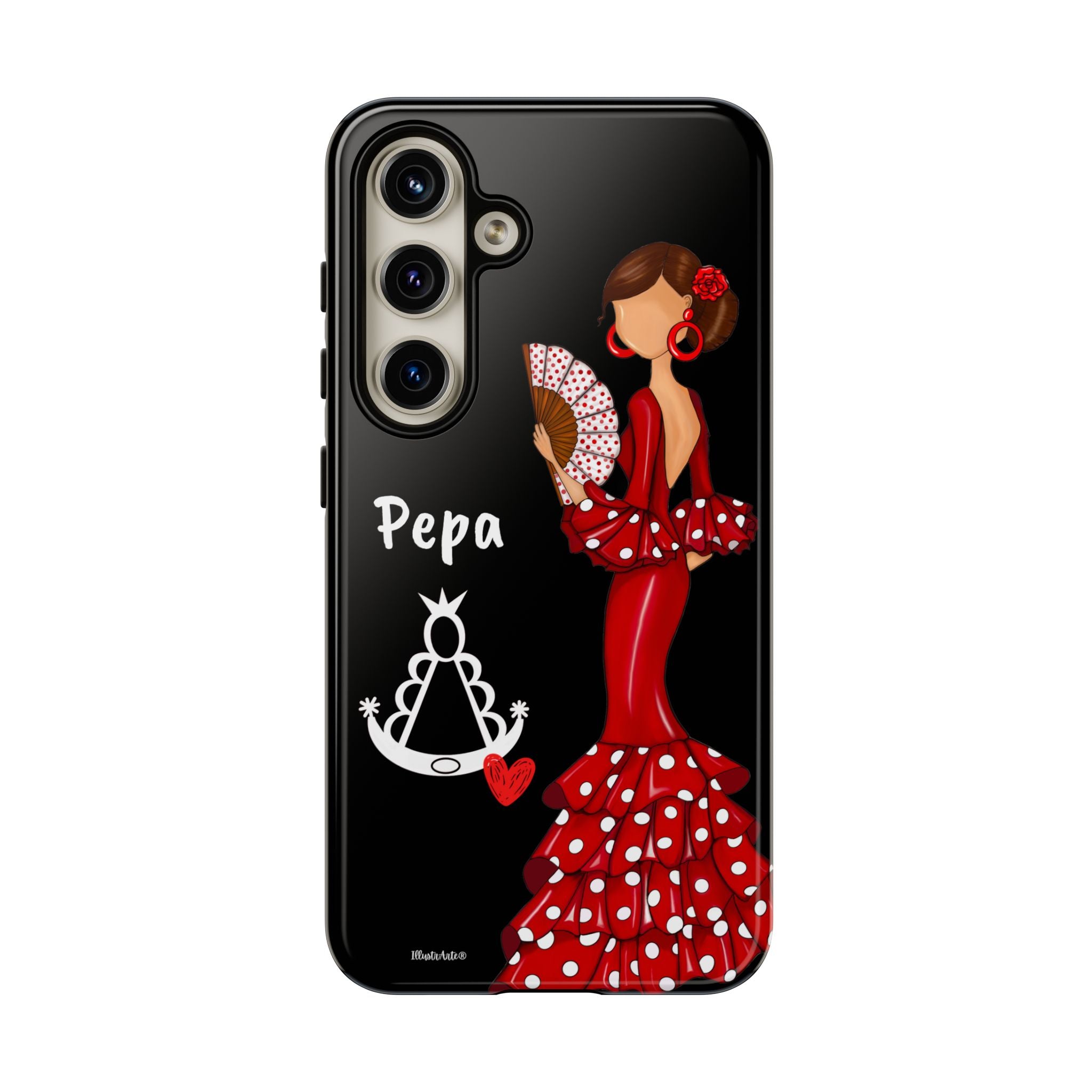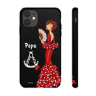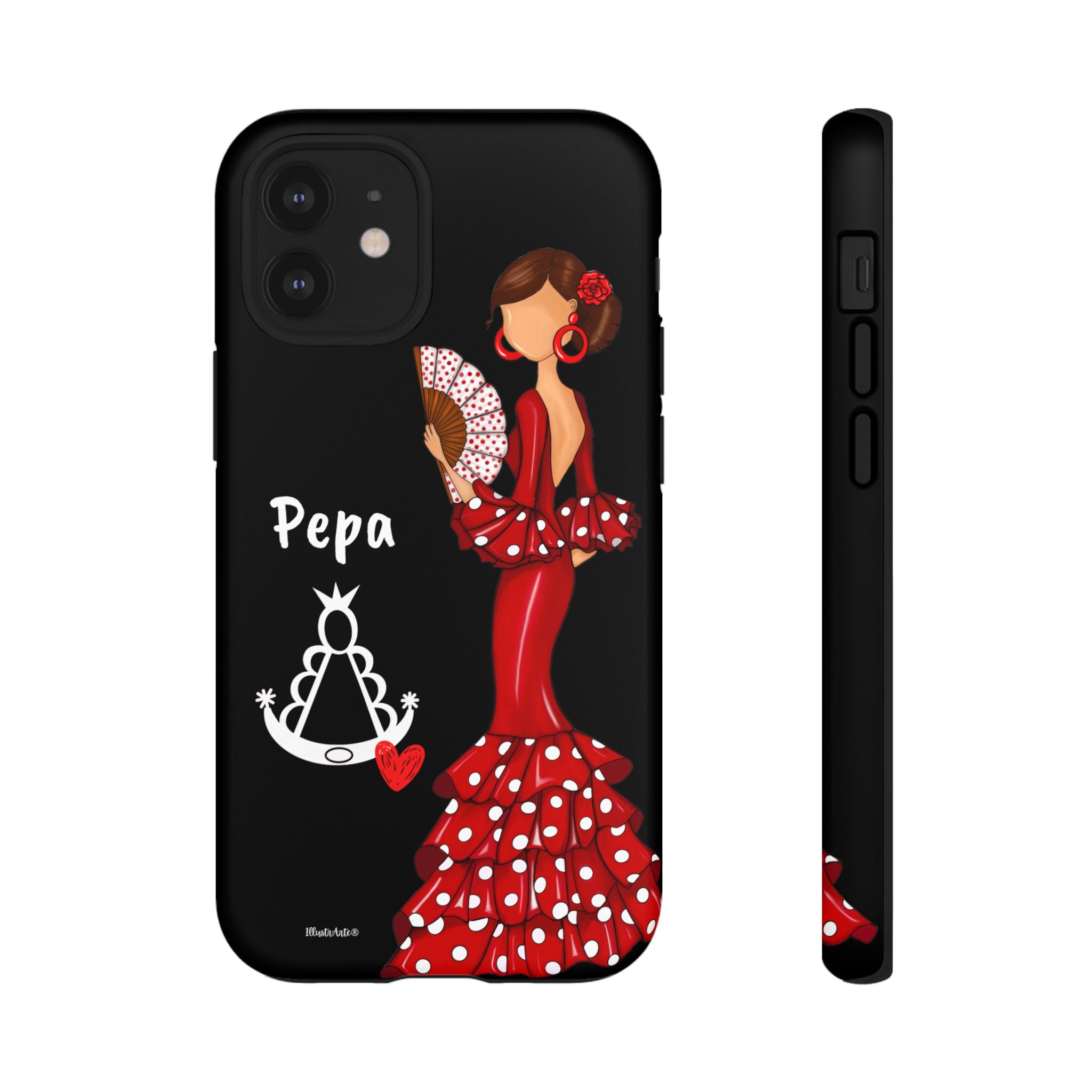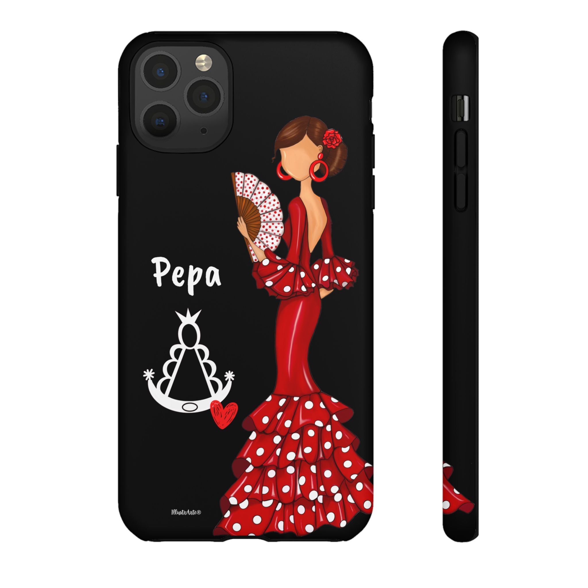 Capa de celular customizável com nome/bandeira/Virgem - modelo Pepa com fundo preto e pequena virgem. Para iPhone, Samsung Galaxy S e Google Pixel.