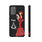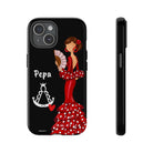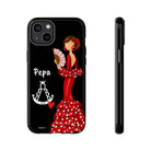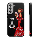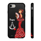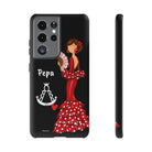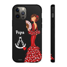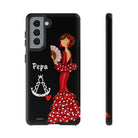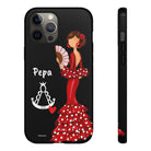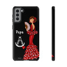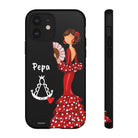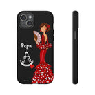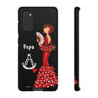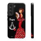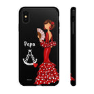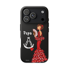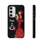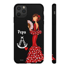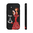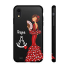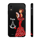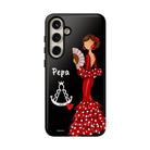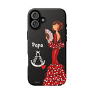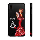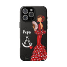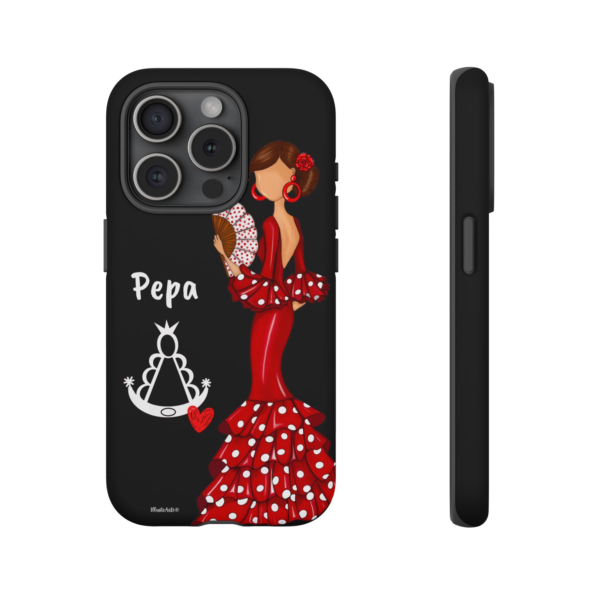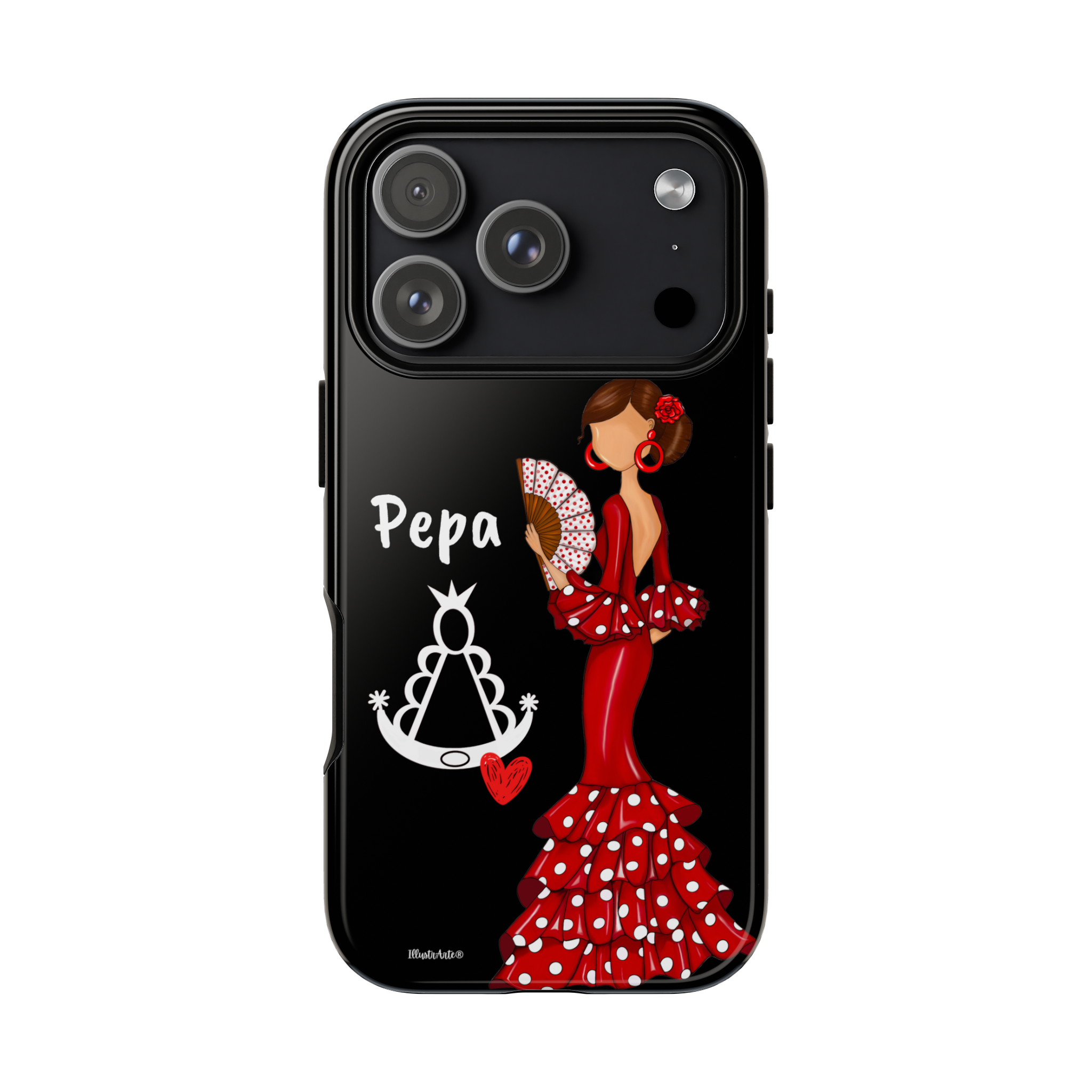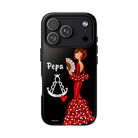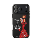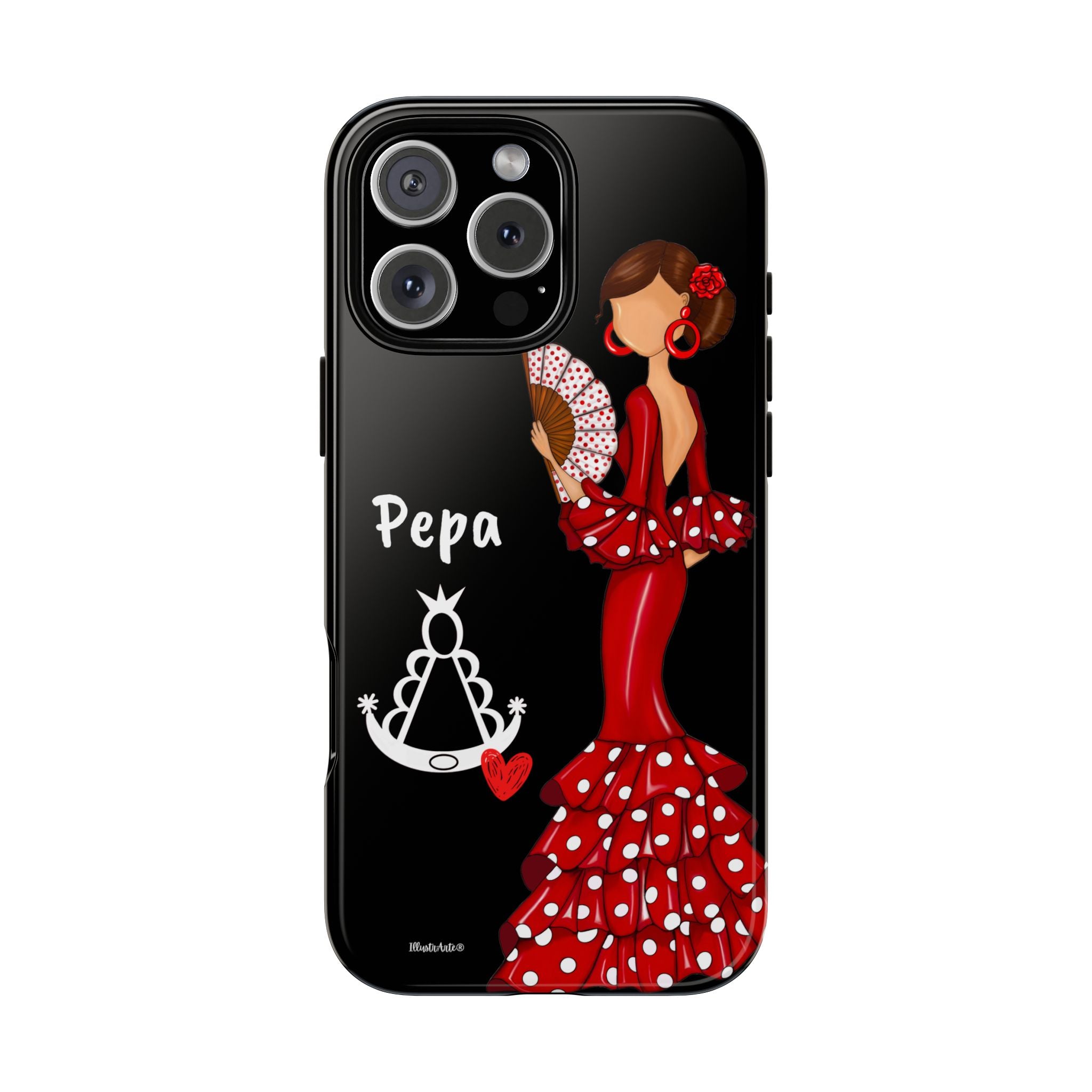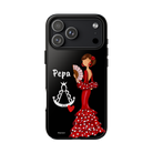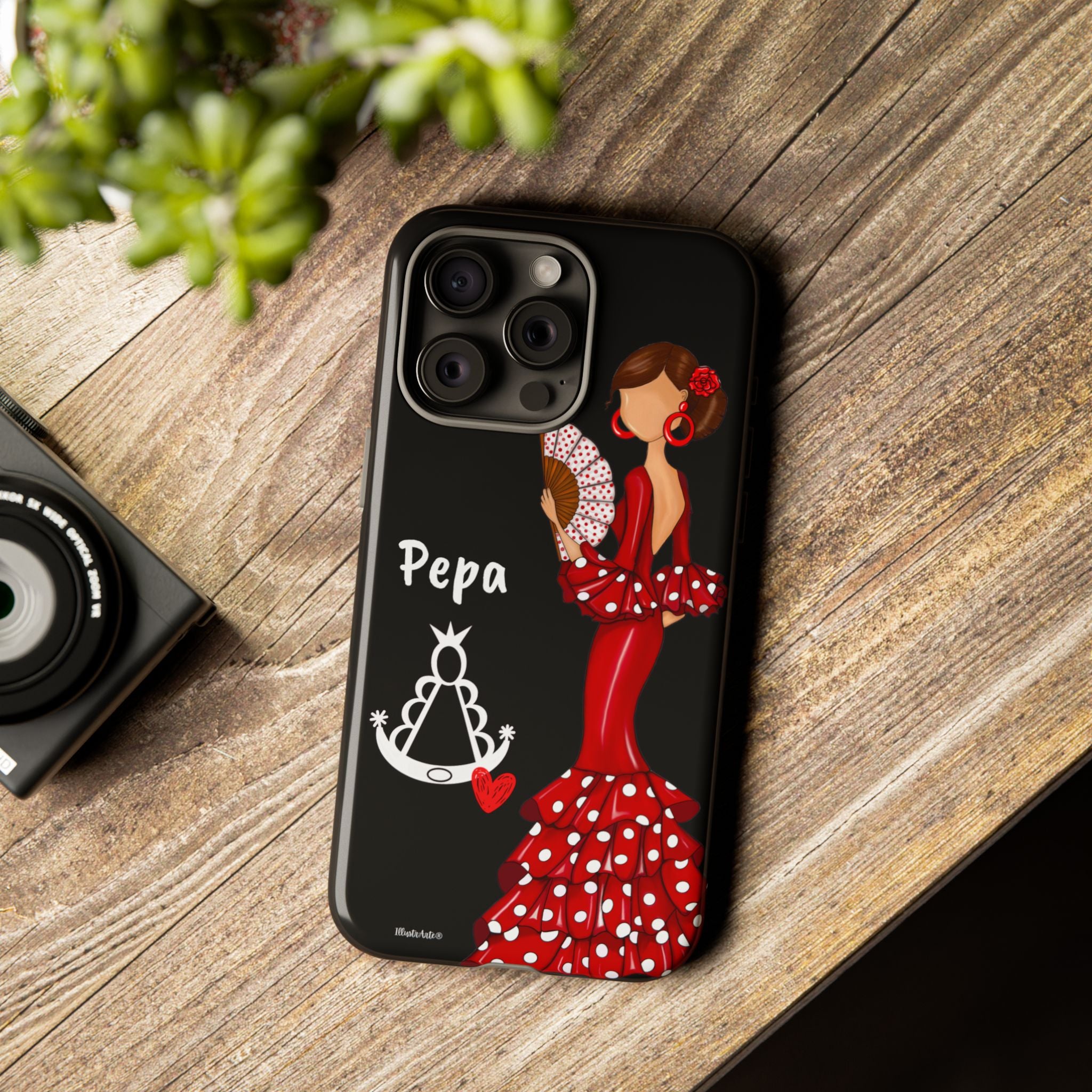 Capa de celular customizável com nome/bandeira/Virgem - modelo Pepa com fundo preto e pequena virgem. Para iPhone, Samsung Galaxy S e Google Pixel.