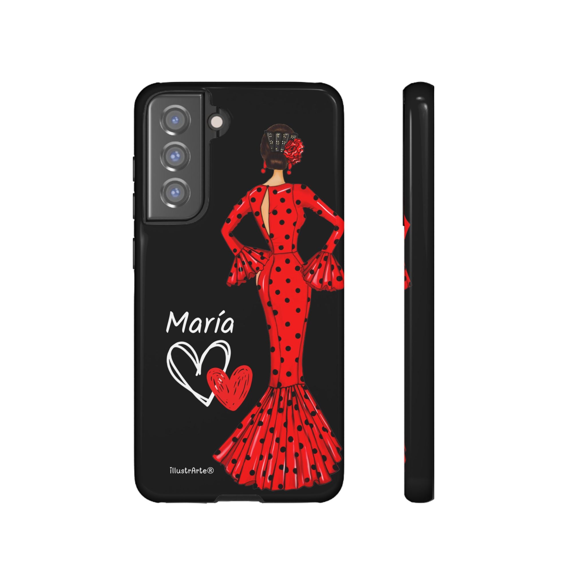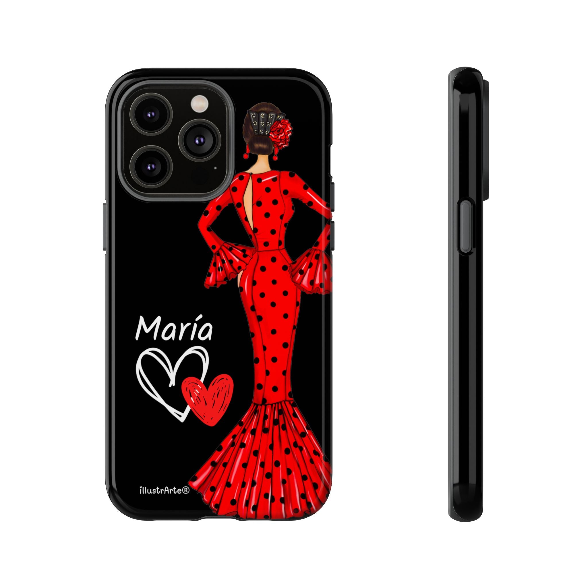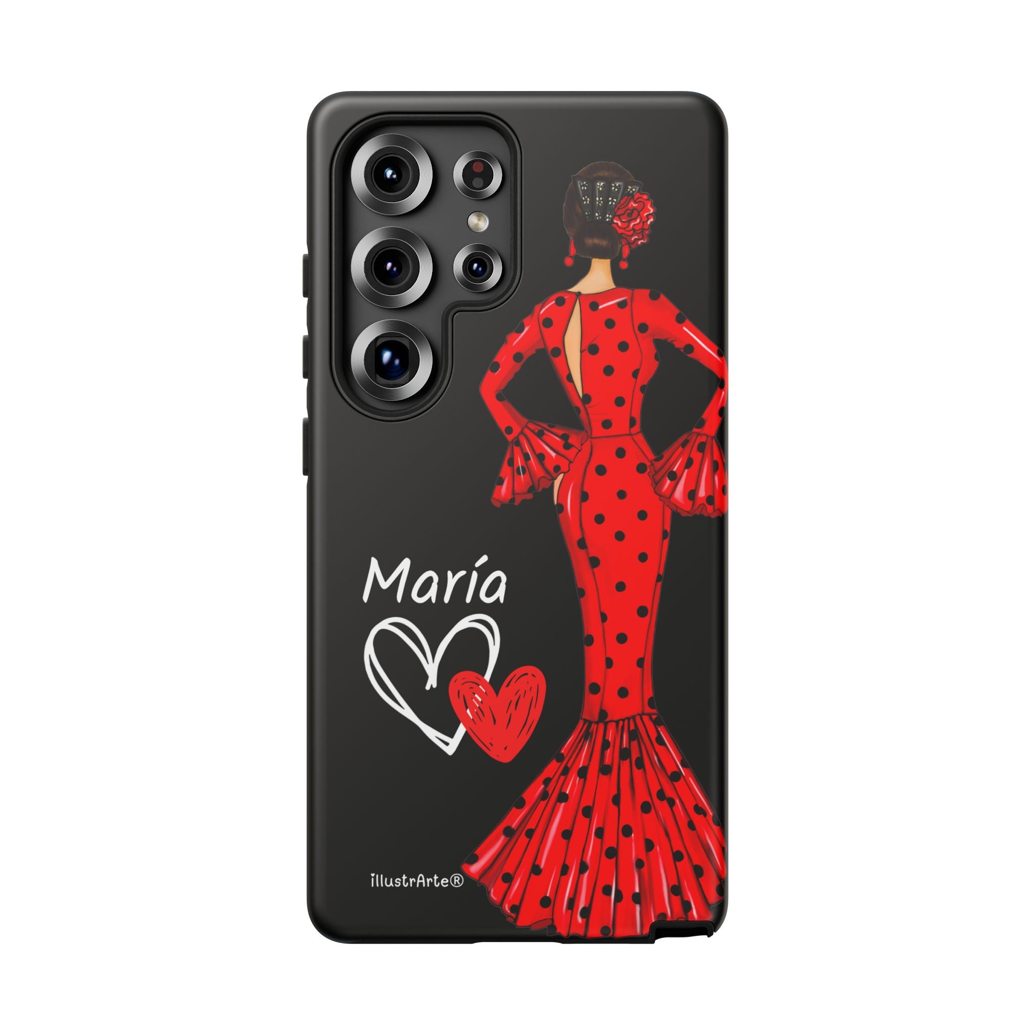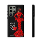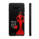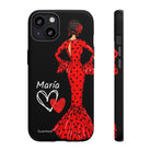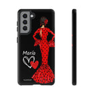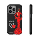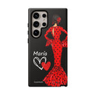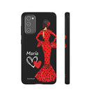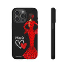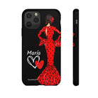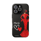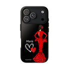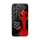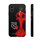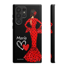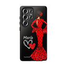 Capa de celular personalizável com nome/bandeira/Virgem - modelo Red Maria com cabelo escuro, fundo preto, para iPhone, Samsung e Google Pixel