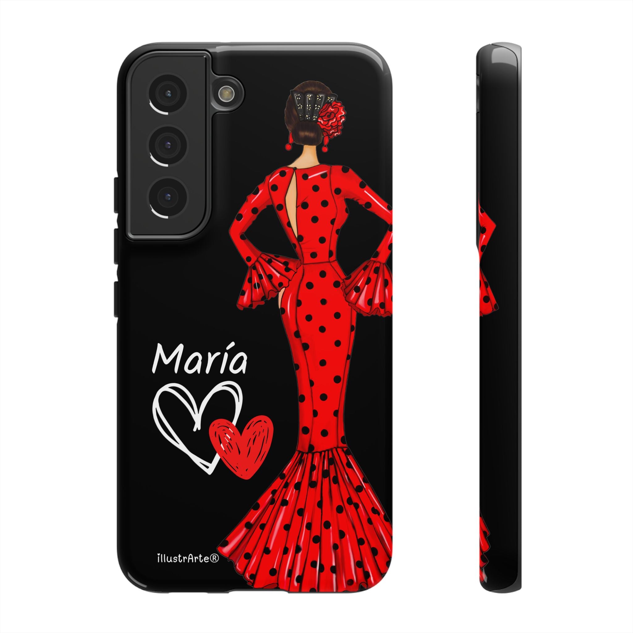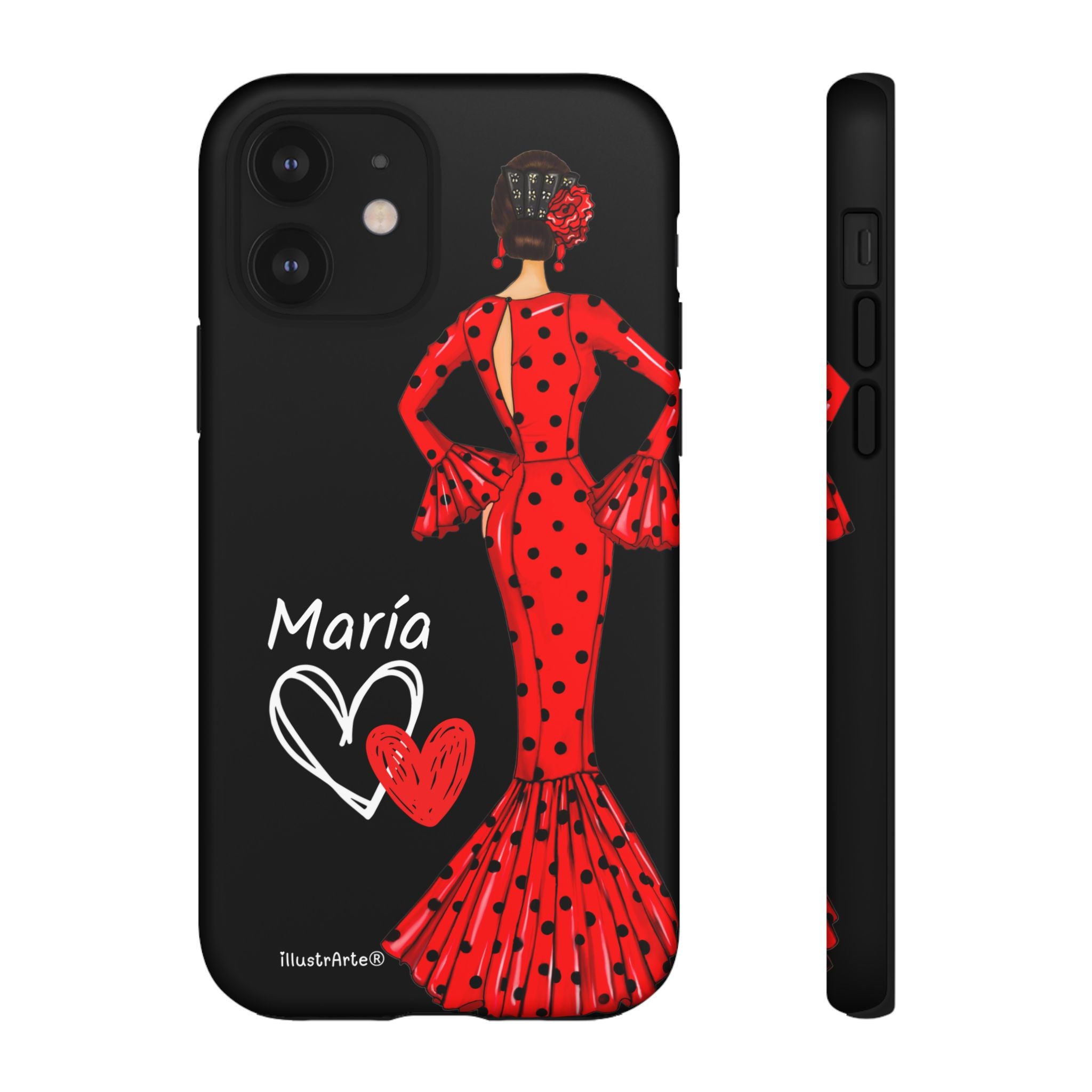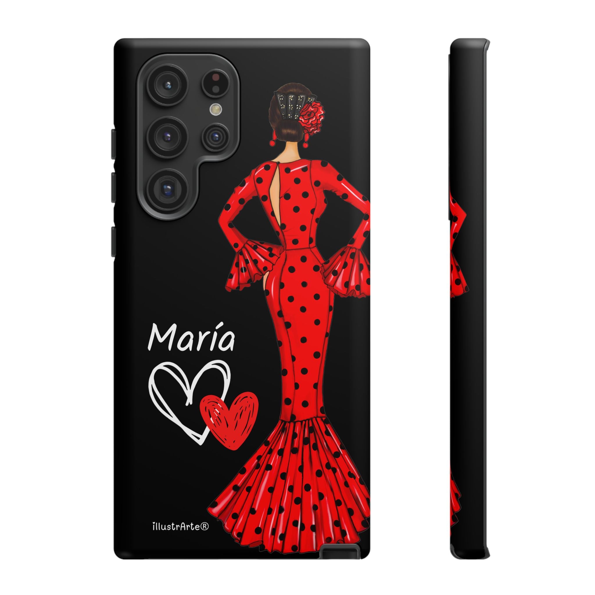 Capa de celular personalizável com nome/bandeira/Virgem - modelo Red Maria com cabelo escuro, fundo preto, para iPhone, Samsung e Google Pixel