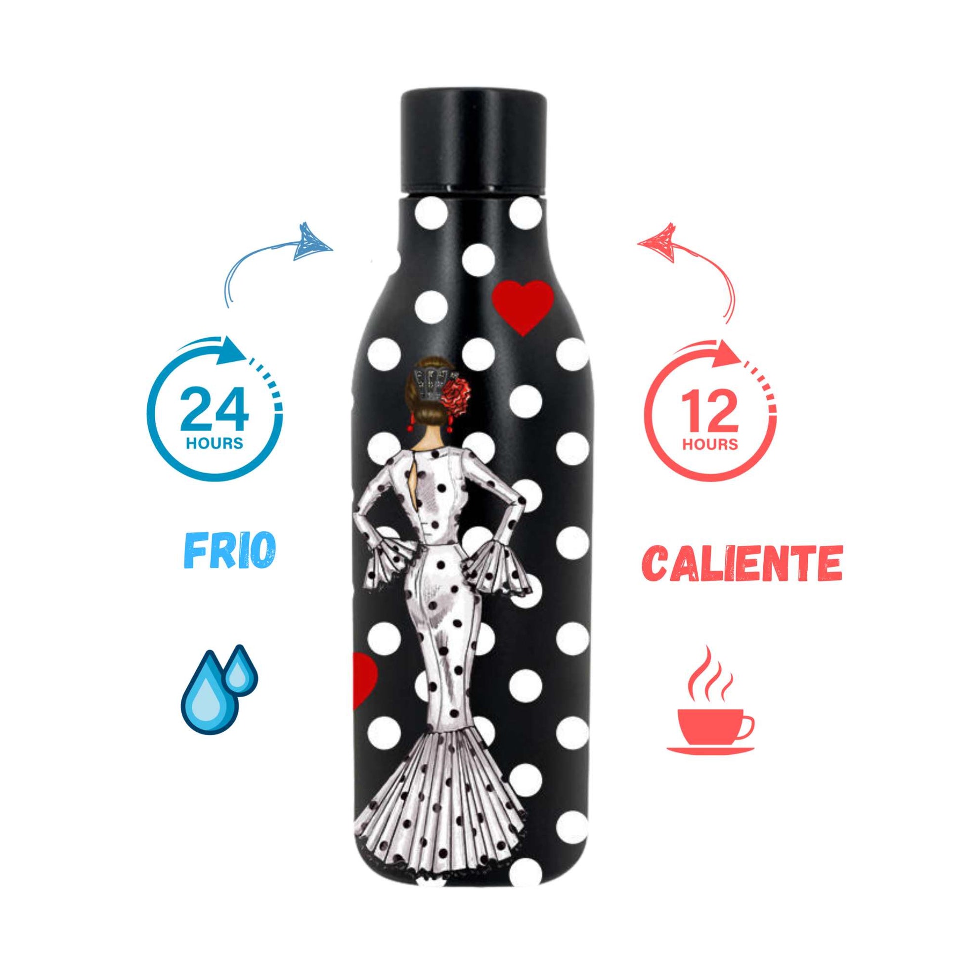 La botella mantiene tus bebidas frías o calientes durante horas, mientras que la bolsa es ligera, resistente y perfecta para acompañarte en el día a día. Un conjunto práctico, bonito y lleno de salero, creado para quienes aman el flamenco y el diseño español.