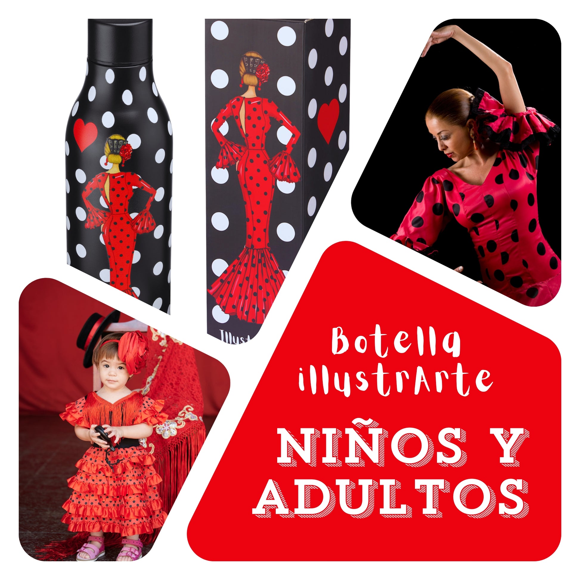Pack Regalo Flamenca María Rojo – Botella Térmica Negra con Vestido Rojo + Bolsa Cádiz “María Rojo” + Neceser Granada “María Rojo Fondo Negro”